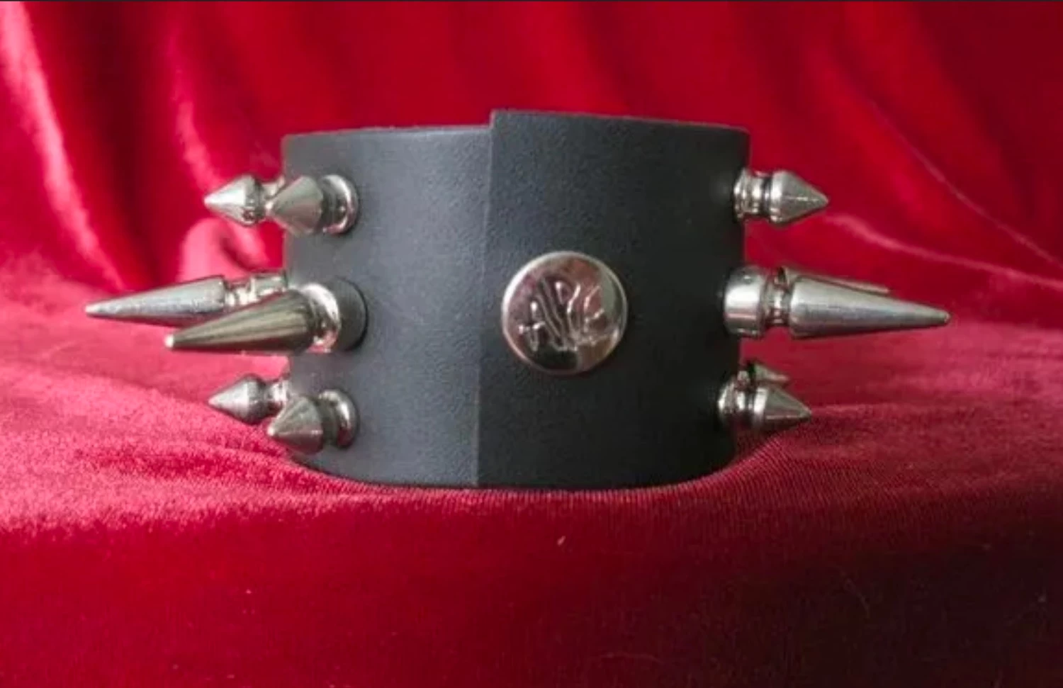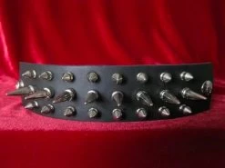 High quality leather wristband with 2 rows of 5/8″ spikes and 1 row of 1″ spikes.