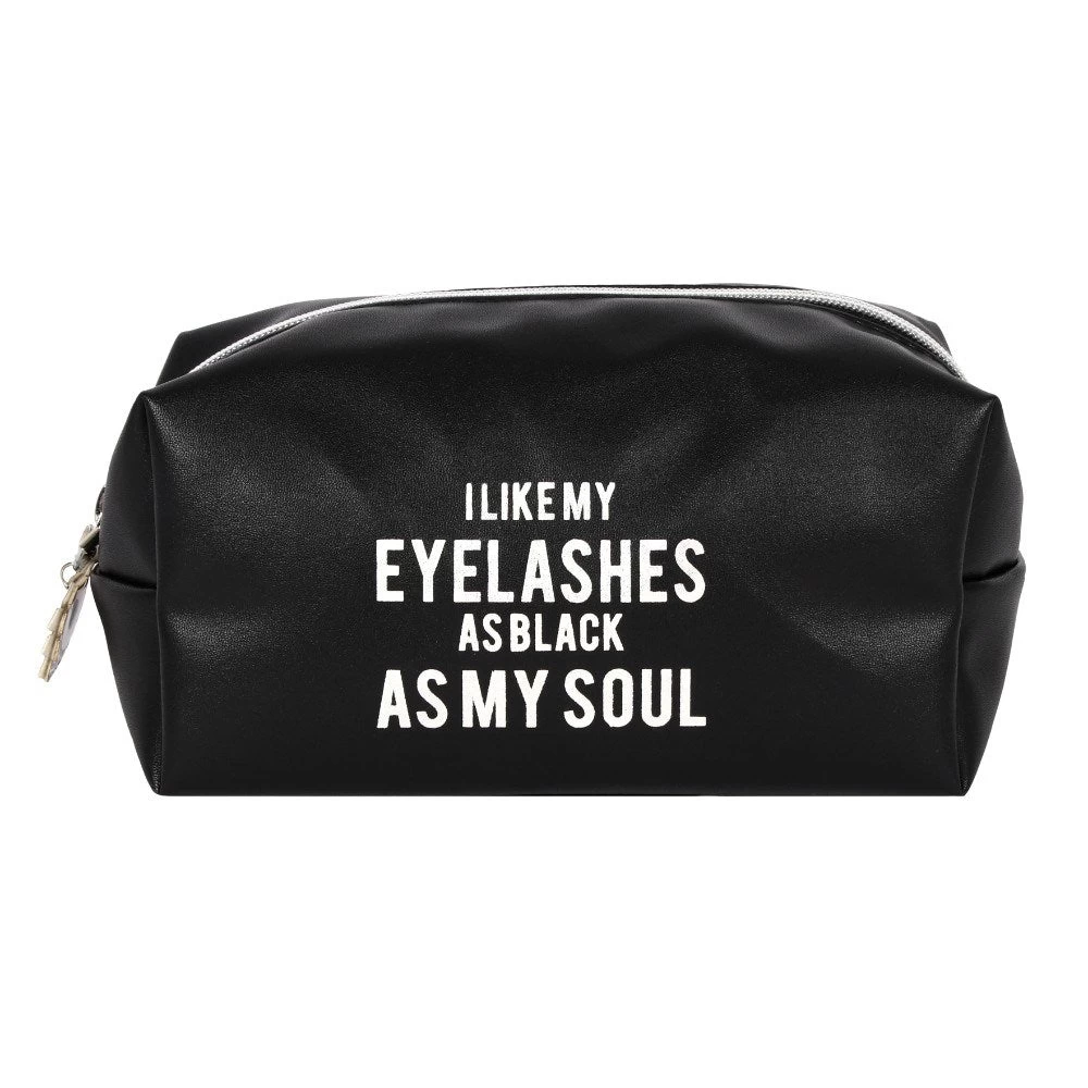 Matte black makeup bag featuring the words ‘I like my eyelashes as black as my soul’.