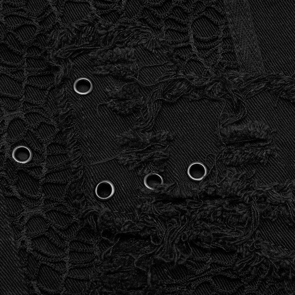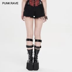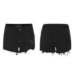 The Bad Seed shorts are made out of thick black denim and feature frayed hems for a grunge look. Heavily detailed, those black shorts feature rips on the two back and two front functional pockets, as well as fishnet appliques. Black PU patches and black metallic hardware complete the look. Fasten with the front zip fly.