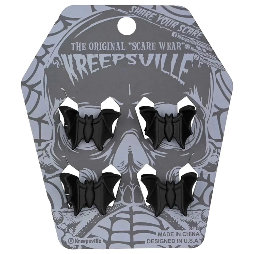 Match your hair to your vampire aesthetic with the Bat Mini Claw Clip Set in Black. This gothic inspired hair accessory comes in a set of 4 mini clips. No butterflies here, go Y2K vamp with mini bats flying around your hair. Made with spring clips and matte black acrylic. Clip size approx 0.75″ H (2 cm) x 1″ W (2.5 cm).