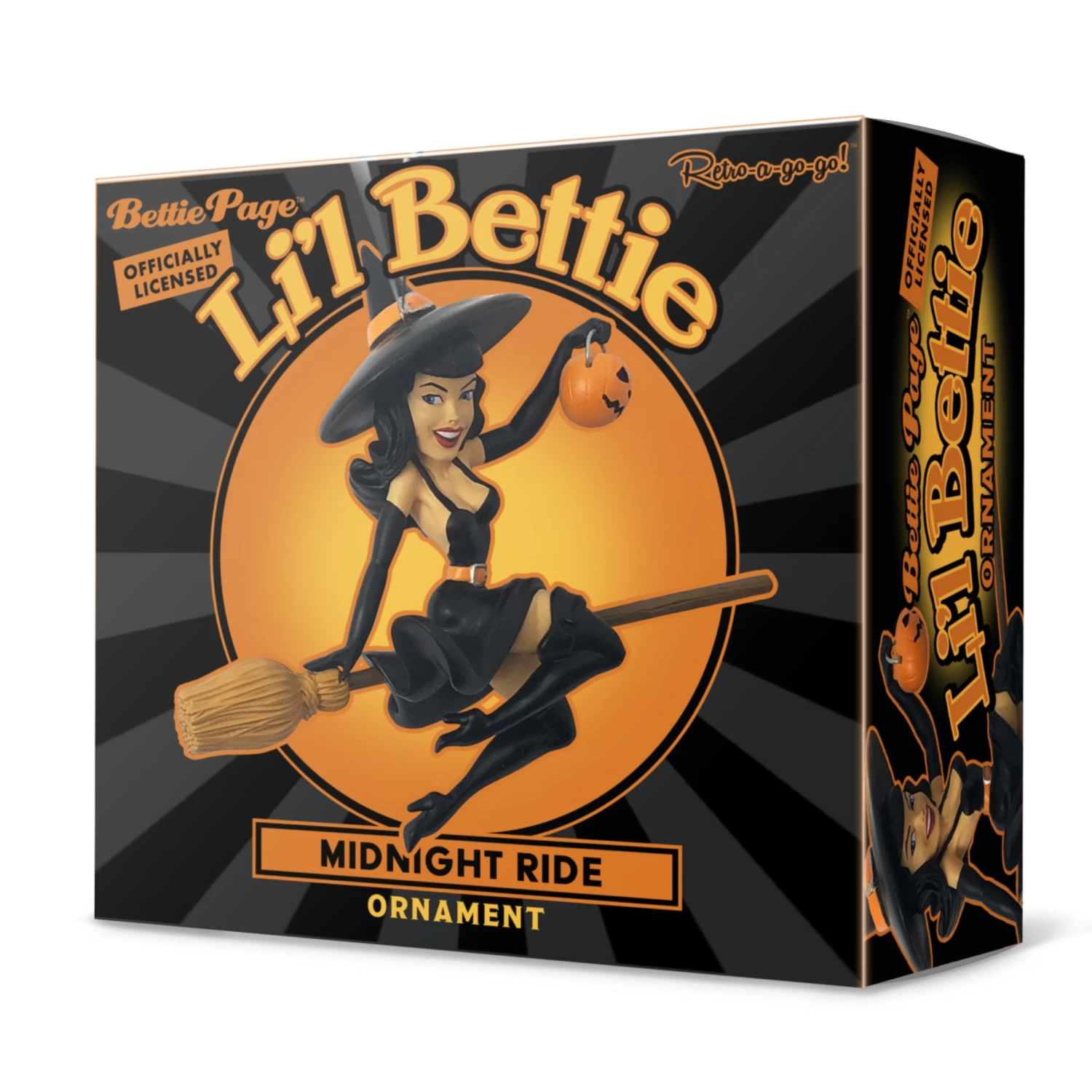 The original 1950’s Pin Up Queen is back and as cute as ever! Introducing the NEW officially licensed, Li’l Bettie Halloween Ornament! Presented in a fun & whimsical cartoon style, sculpted, and cast in fine detail and hand painted in classic Halloween colors! This special edition Bettie is wearing a black dress with matching gloves, boots and hat holding her classic Halloween pumpkin and is ready to hang right out of the box. Whether you’re a Bettie fan or love retro pin up art (or both!), you’ll fall in love with your collectible Li’l Bettie. She promises to make your trick-or-treat even more sweet!