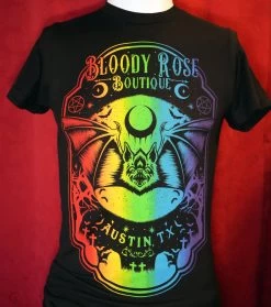 The Bloody Rose Boutique Rainbow Pride Bat unisex t-shirt featuring original artwork by dark artist Liuz Flora and printed in Austin, TX by Pallbearer Press.