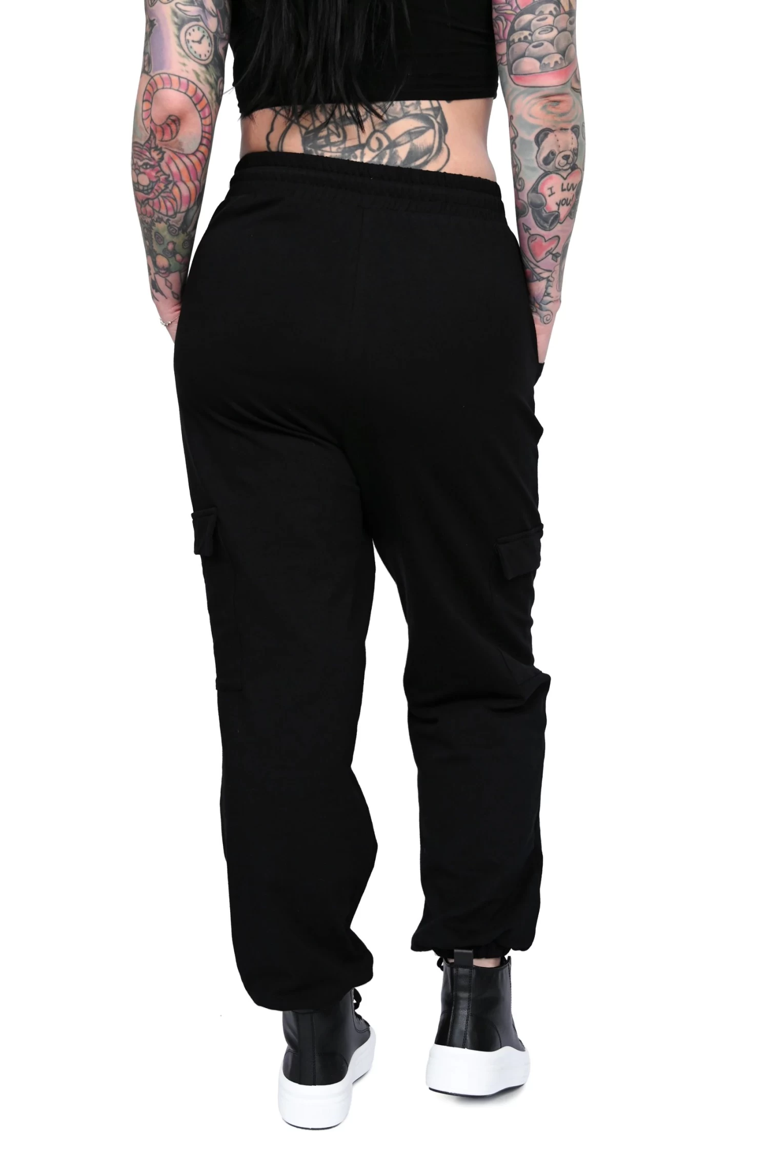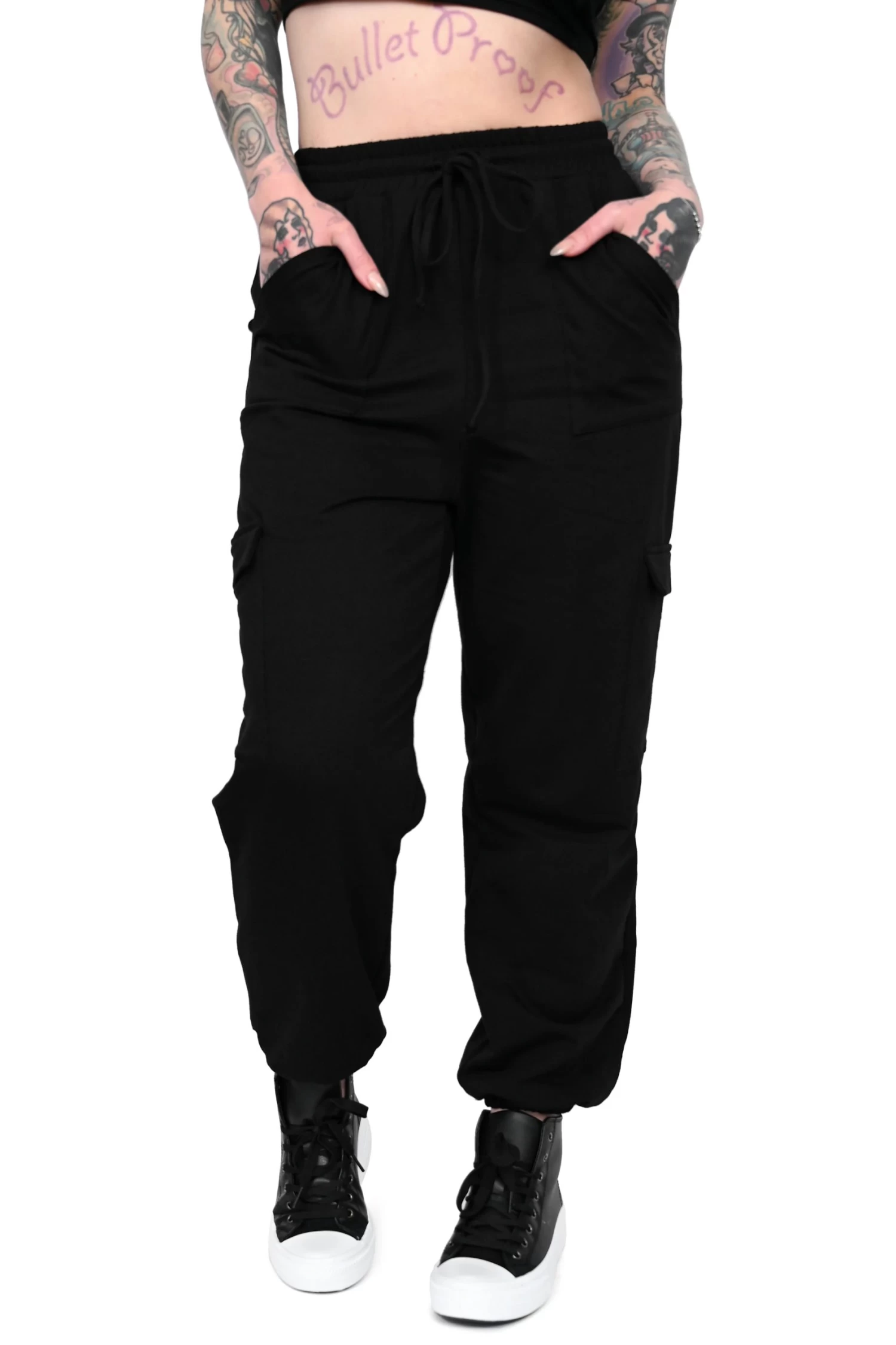 Black drawstring joggers with 2 front pockets and 2 side pockets.