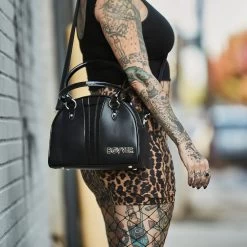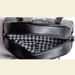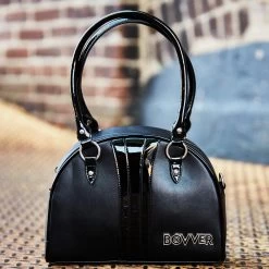 Inspired by vintage sport carryall handbags the Bovver bowler will quickly become your “go to” bag. Created with durable black matte vinyl, while handles and striping are detailed in a black gloss finish. Handles are reinforced by silver round studs. Signature metal Bovver hardware. Detachable crossover strap is included. Inside you’ll find black and white houndstooth satin lining featuring 1 zipped pocket and 2 side slit pockets.