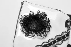 The dark Lolita face mask from Punk Rave. Black and white faux leather mask with lace decoration features an adjustable strap and ventilation holes for easy breathing.