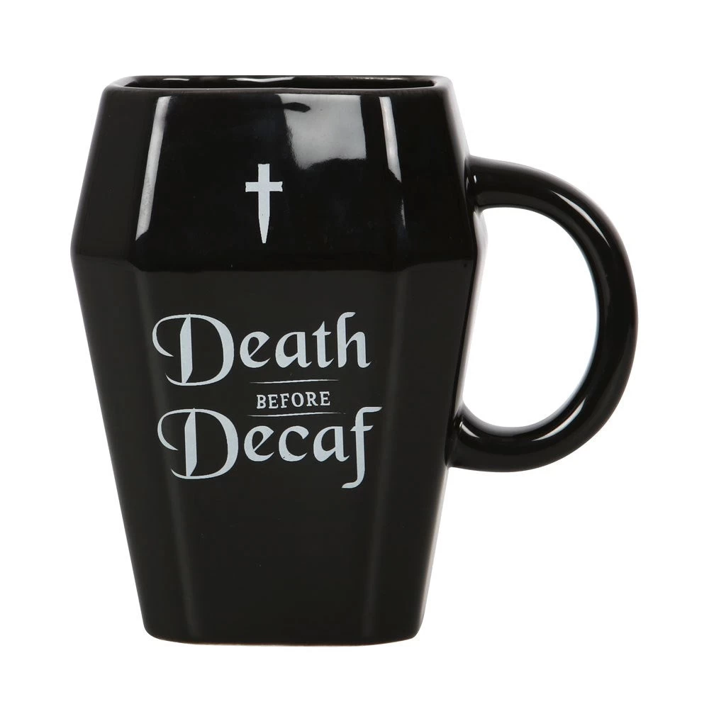 A unique, coffin-shaped mug with ‘Death before decaf’ text for those who can’t go long without a caffeine fix. 310ml capacity. Microwave safe. Handwash only.