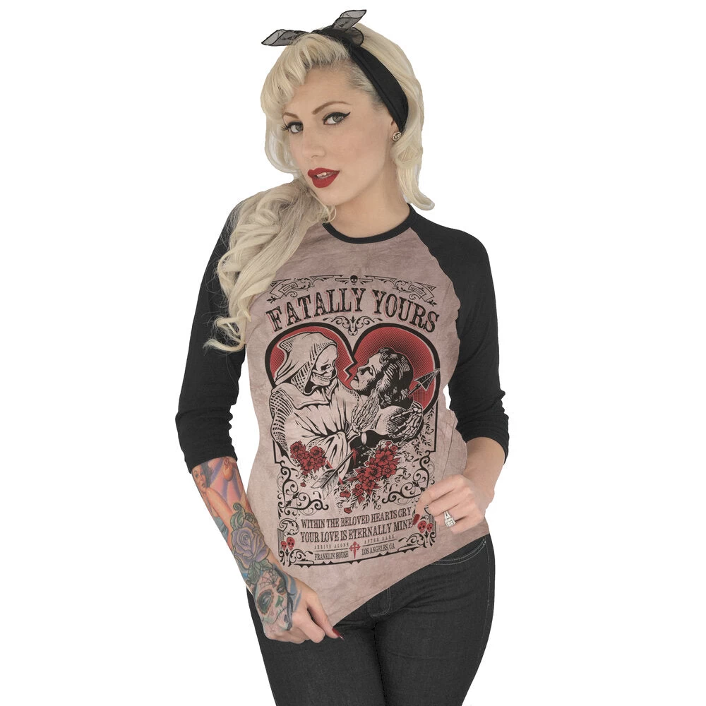Fatally Yours Women’s Raglan Tee is black and red on Cream with black 3/4″ Sleeves. 100% Cotton and pre-shrunk. Sizes Range From Small to XXL.