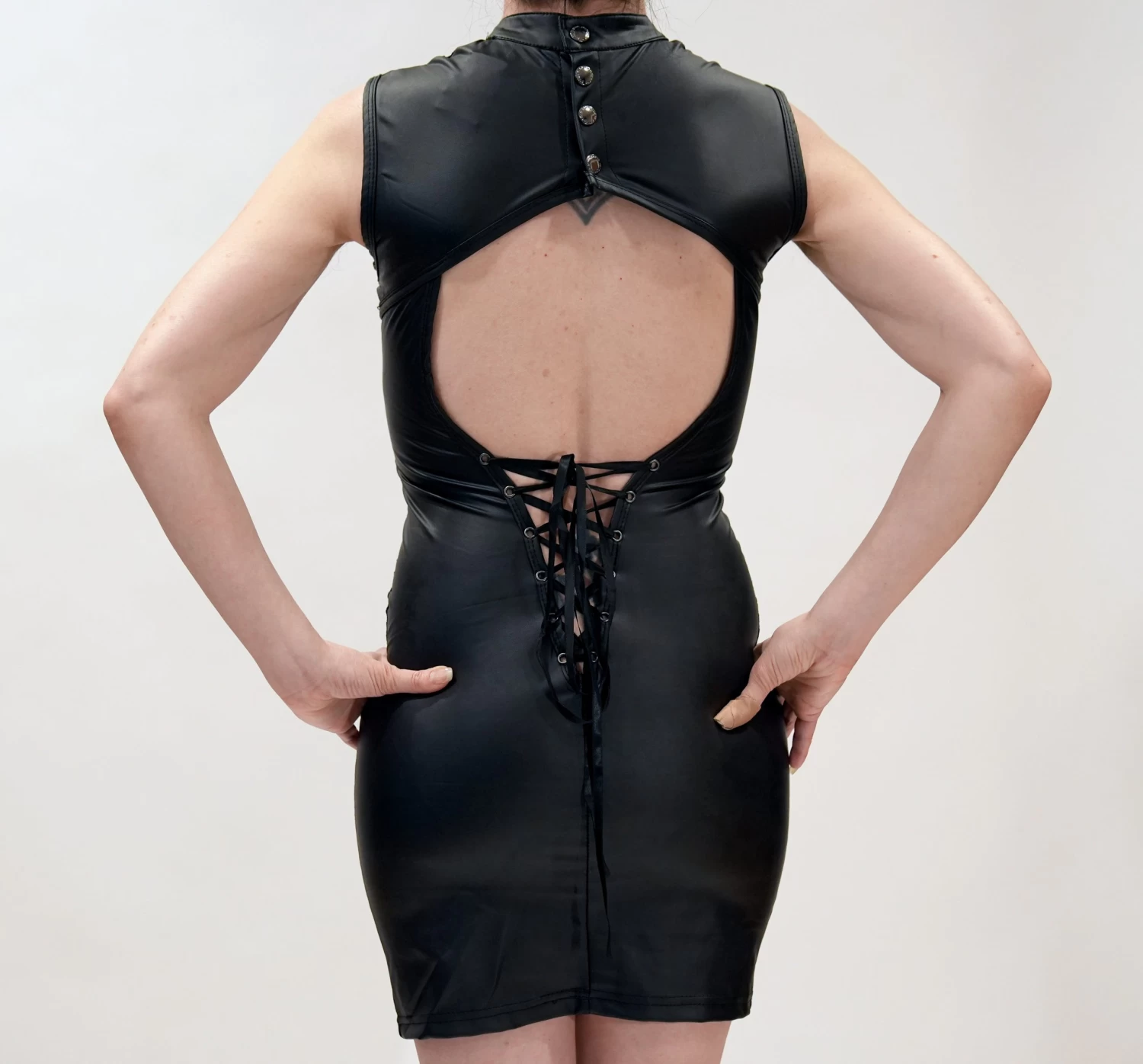 Faux leather and lace keyhole hole dress with lace-up waist and snap closure on the neck.