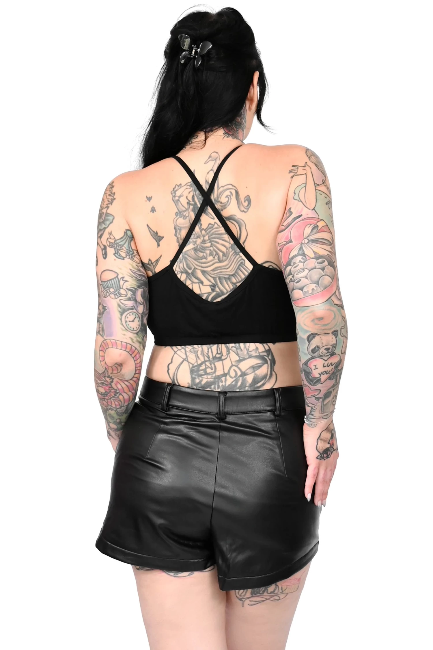High waisted faux leather shorts with slight stretch. Cuffed bottom hem.