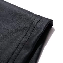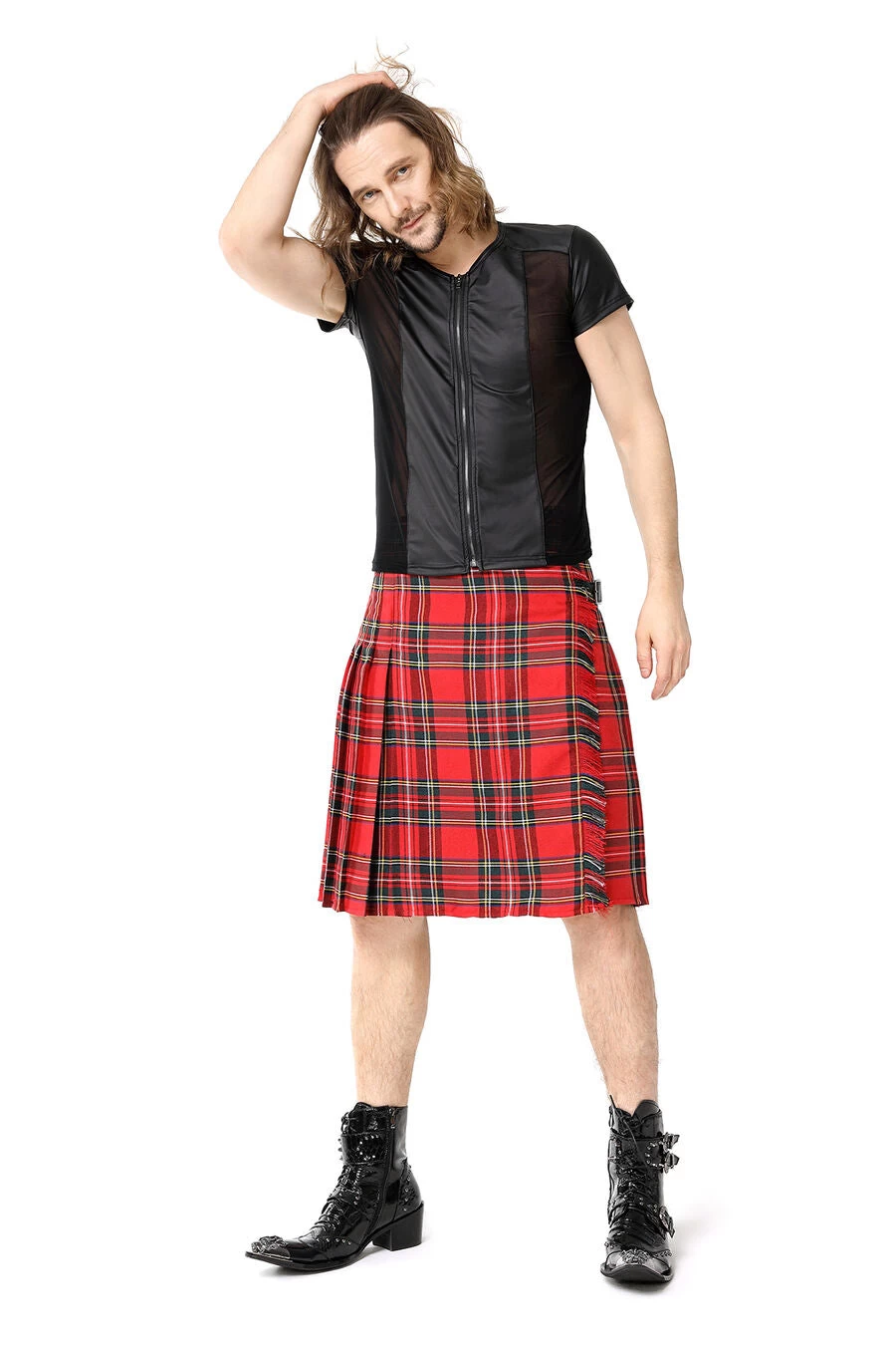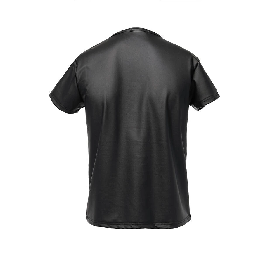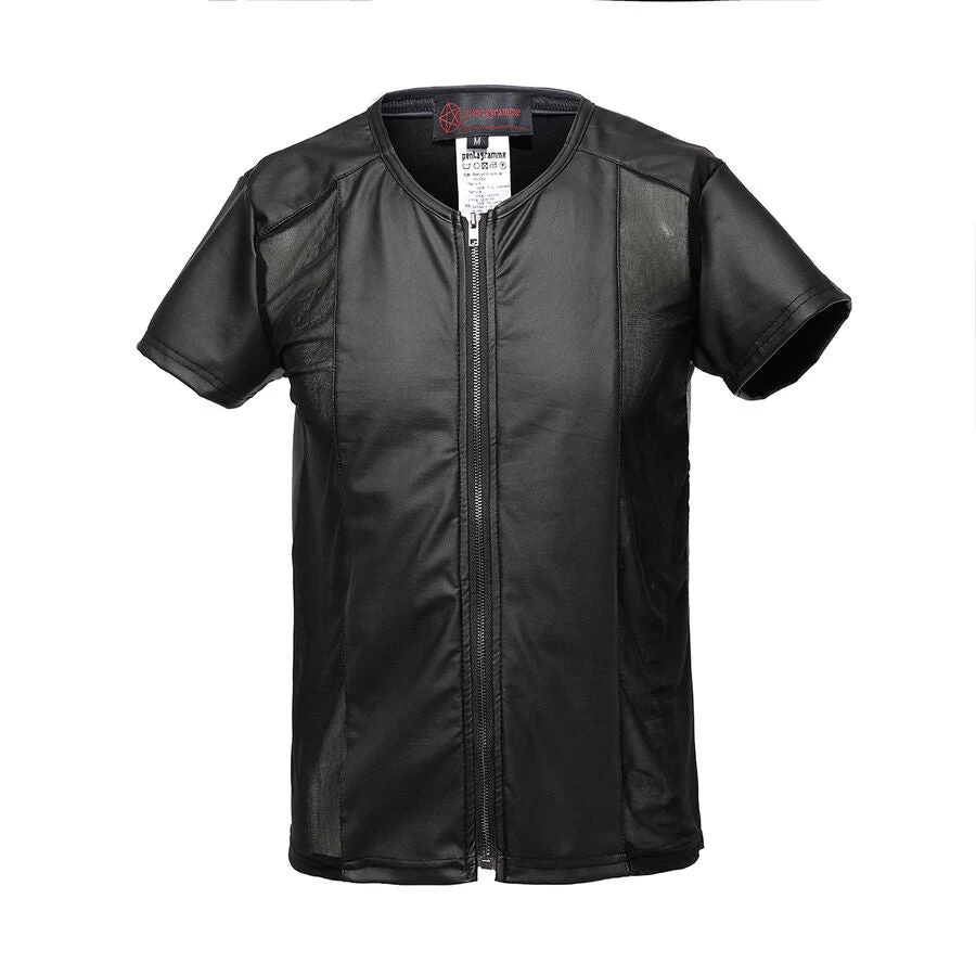 Gothic faux leather t-shirt with mesh panels for men. This sexy shirt zips up the front and has short sleeves and mesh panels on the front.