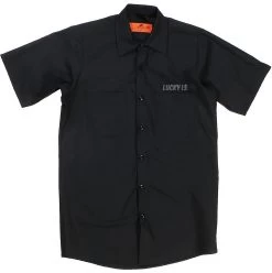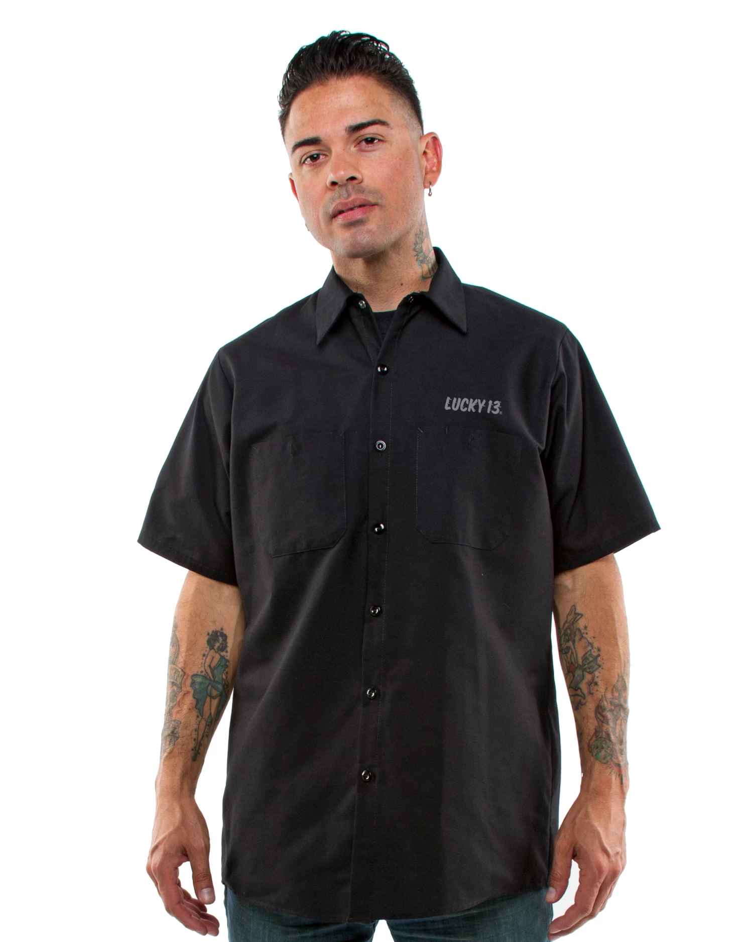 The FRANKIE’S GARAGE Men’s short sleeve work shirt is a cotton/poly blend fabric with Touchtex technology, which has superior color retention, soil resistance, durable press and wick-ability. It has a two-piece lined collar with sewn-in stays, six button front with gripper at the neck. Two button-through, hex-style pockets with a “Lucky 13” embroidery above the left one. The back is printed with the “Frankie’s Garage” vintage style chop shop graphic.