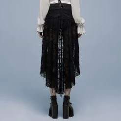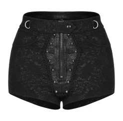 Black Gothic coffin shorts by Punk Rave. Made from a soft, stretchy fabric with a black on black print and features a coffin on the front and a detachable rear skirt.