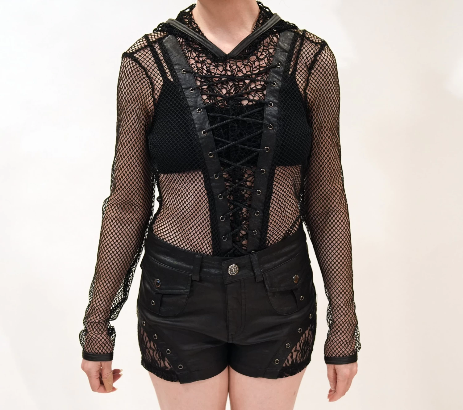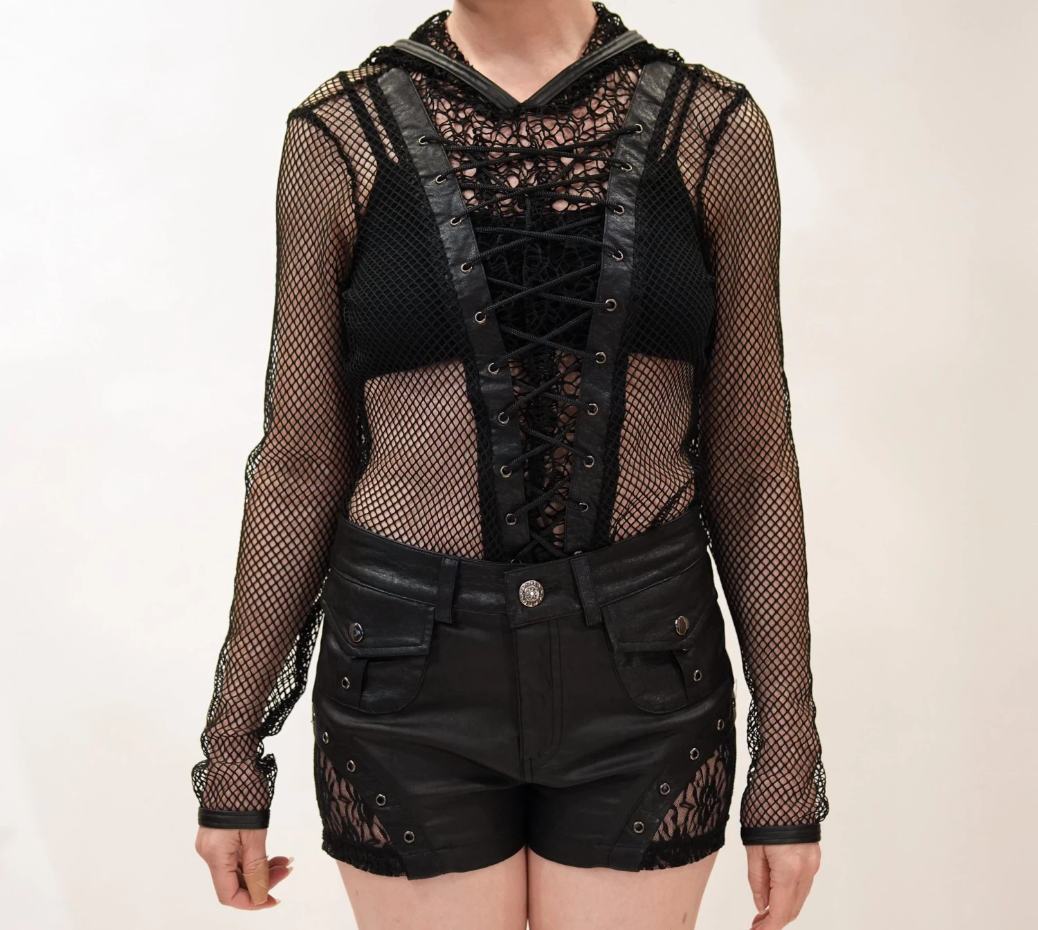 Gothic fishnet and faux leather hooded shirt for women. This sexy pullover fishnet shirt has lace-up accents on the front.