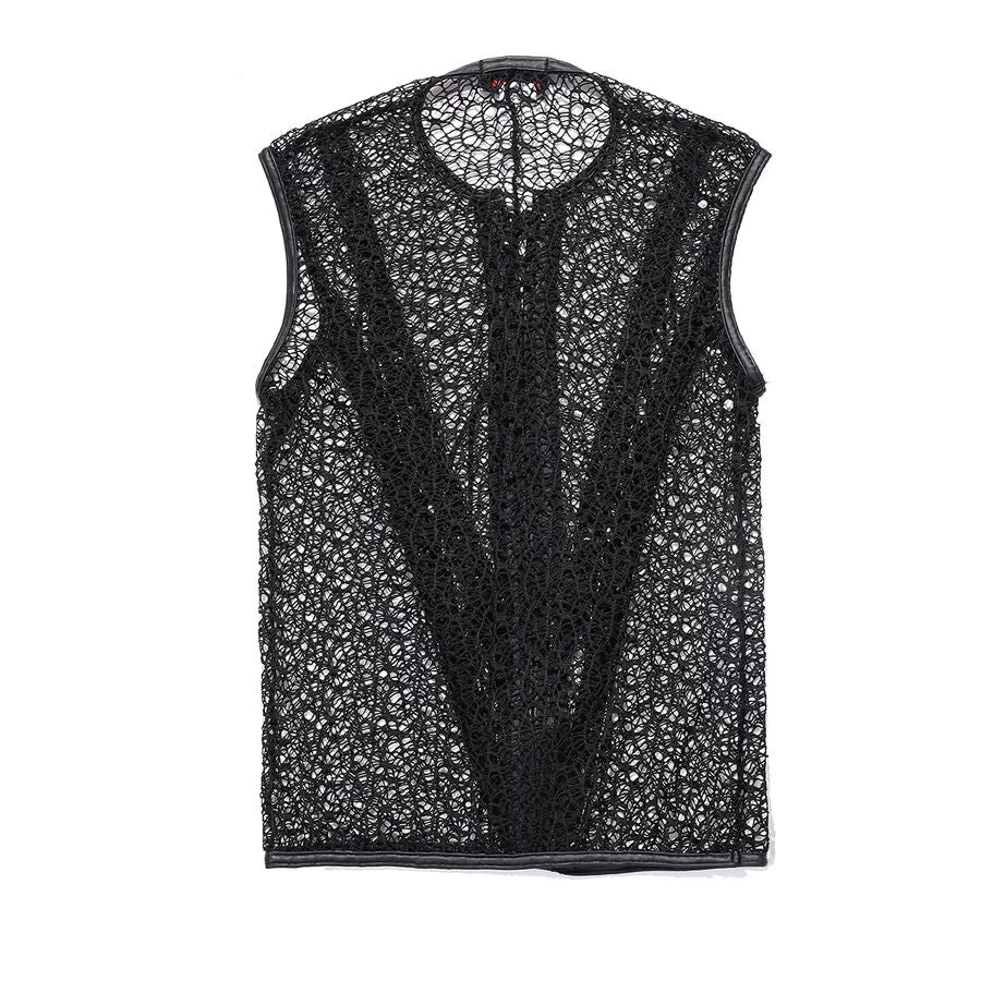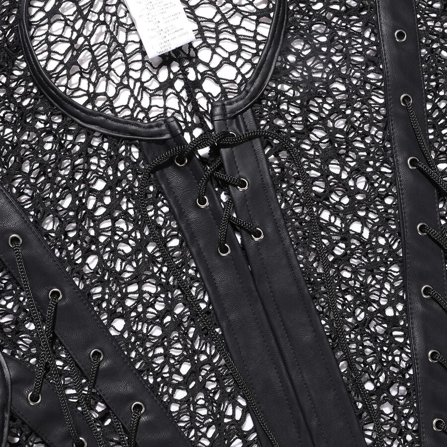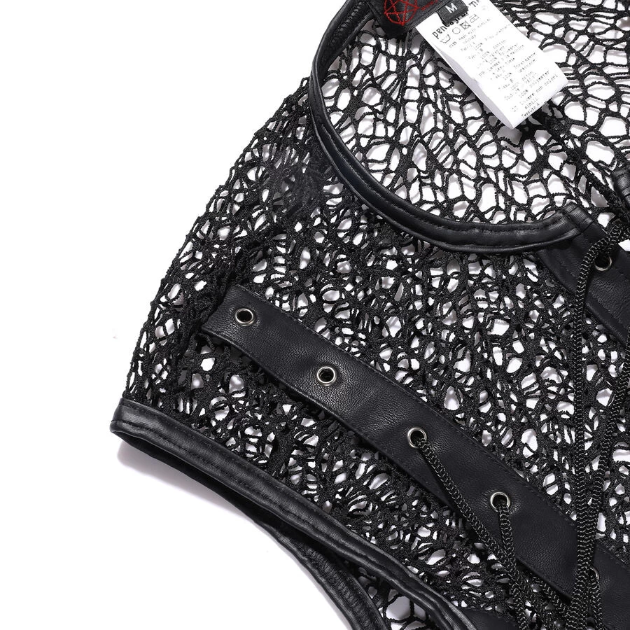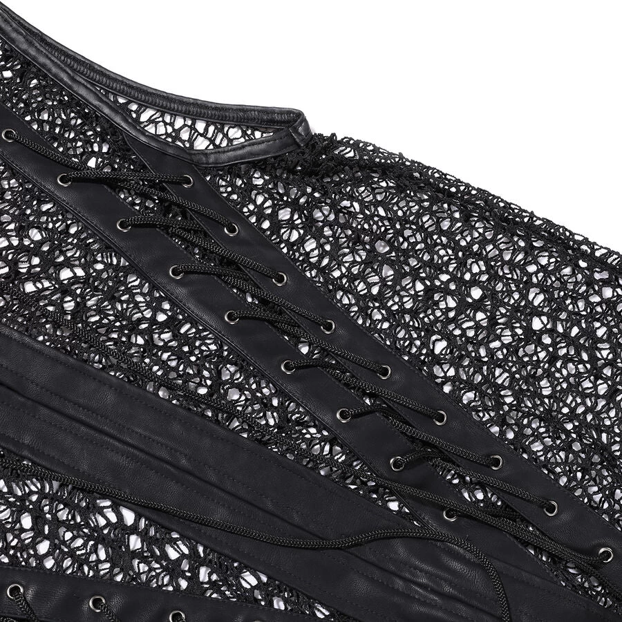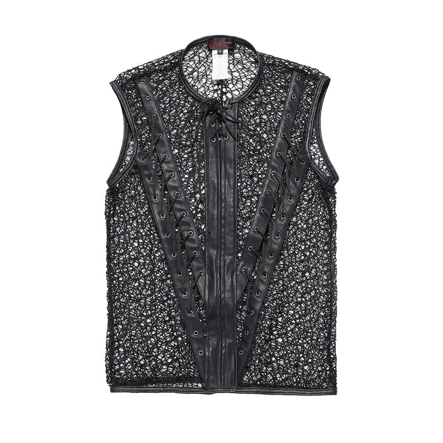Gothic fishnet and faux leather t-shirt for men. This sexy fishnet shirt zips up the front and has lace-up accents on the front.