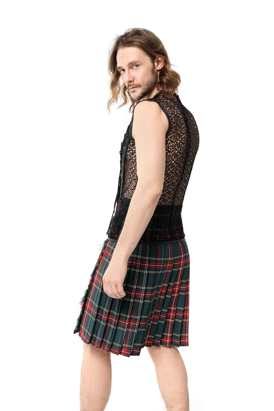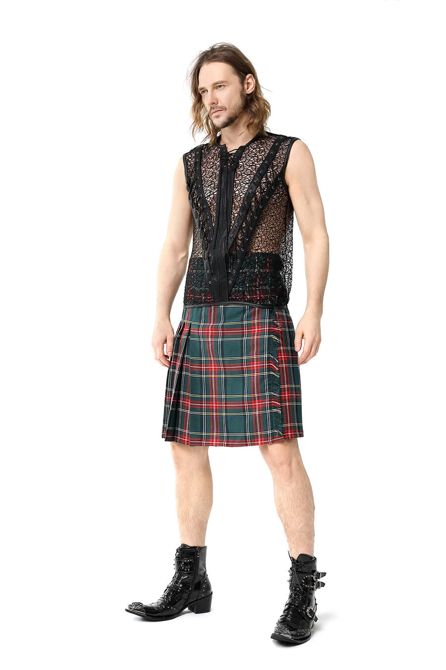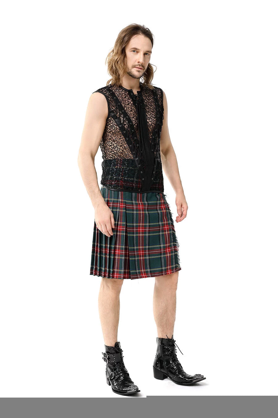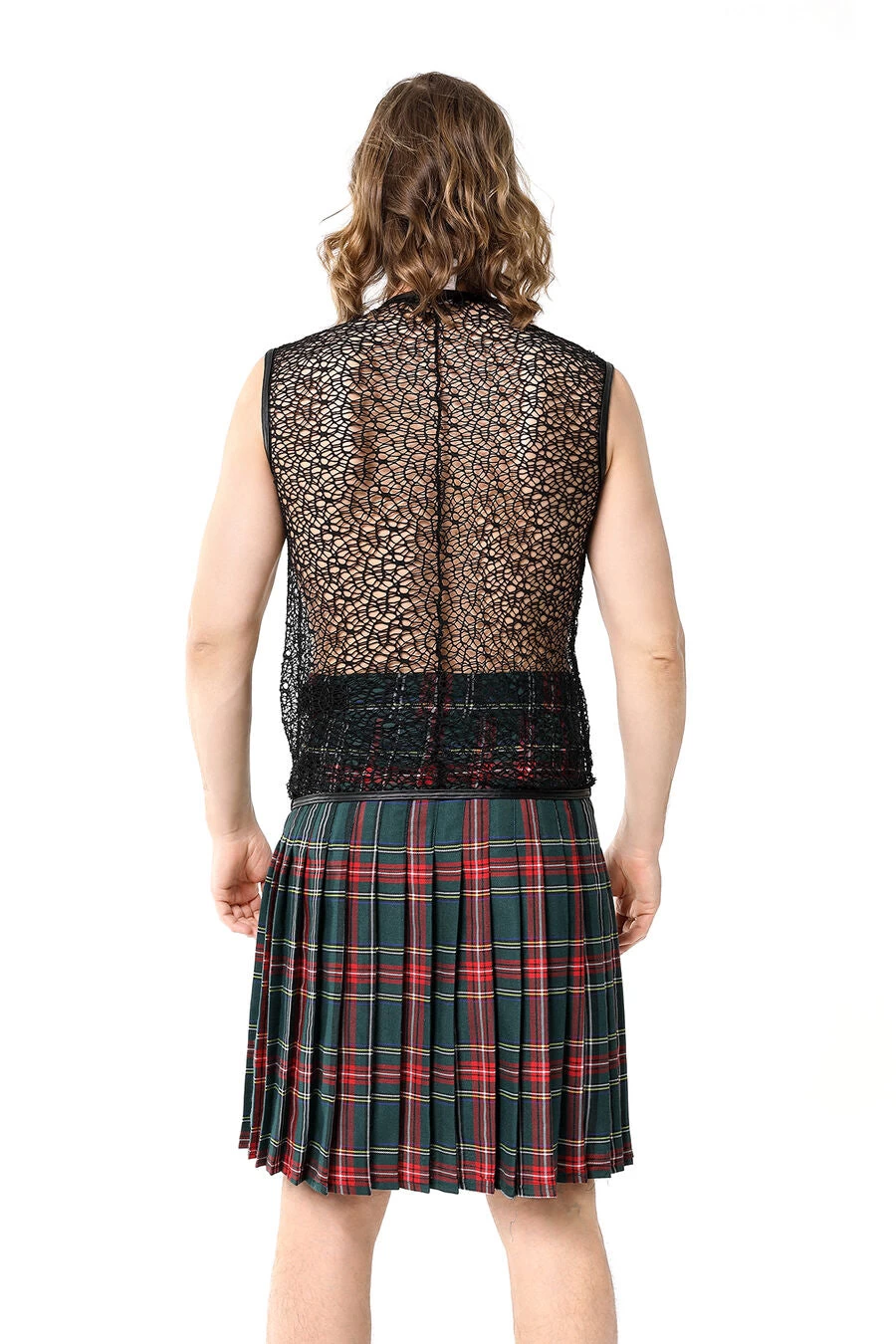 Gothic fishnet and faux leather t-shirt for men. This sexy fishnet shirt zips up the front and has lace-up accents on the front.