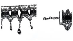 Embark on an adventure of daring fashion with this Gothic Lolita Black Lace Coffin Choker. Hand sewn coffin shaped beads and delicate suspended chain pendants come together in a breath-taking display of the bold and beautiful. Perfectly adjustable, it’s time to make a statement.