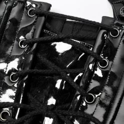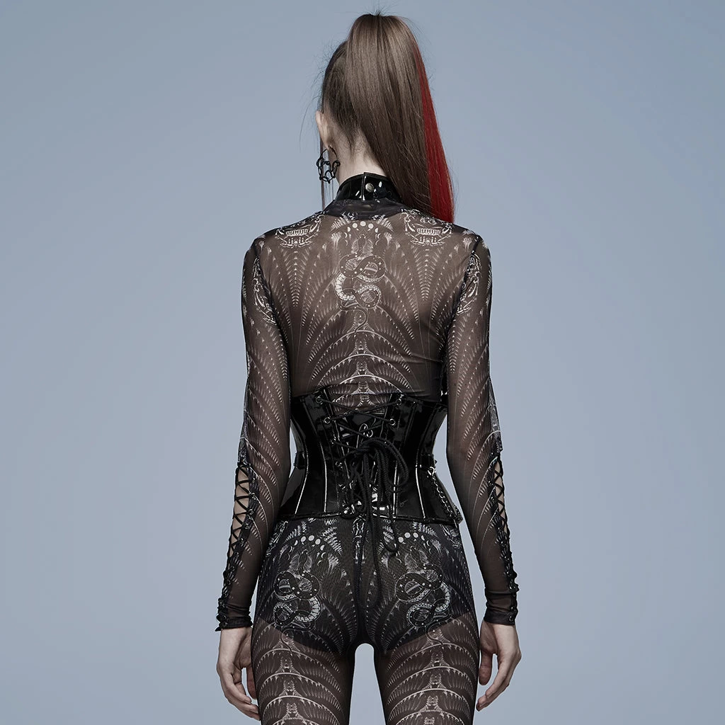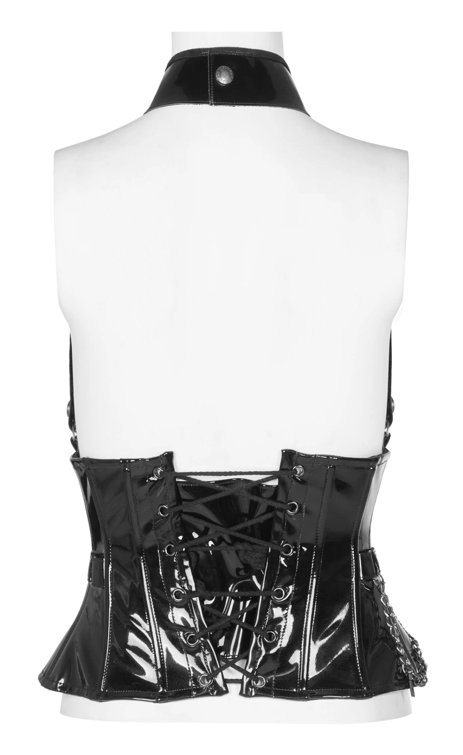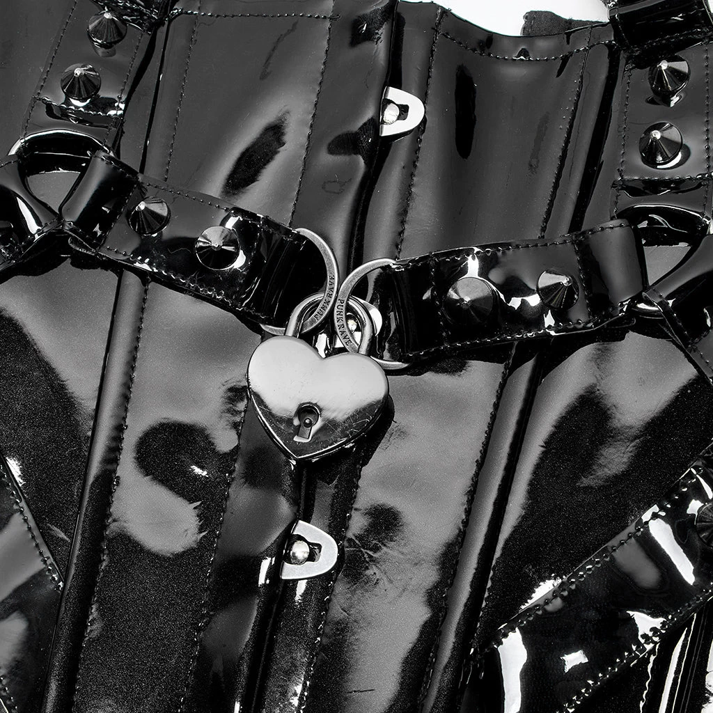 Gothic patent leather corset by Punk Rave. Features skull, chain, rivet, heart lock, and buckle accents, adjustable lacing up the back and removable straps. The whole chest loop can be detached and used as an independent waist cincher.