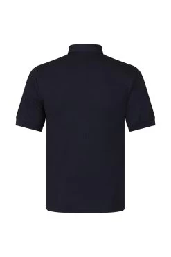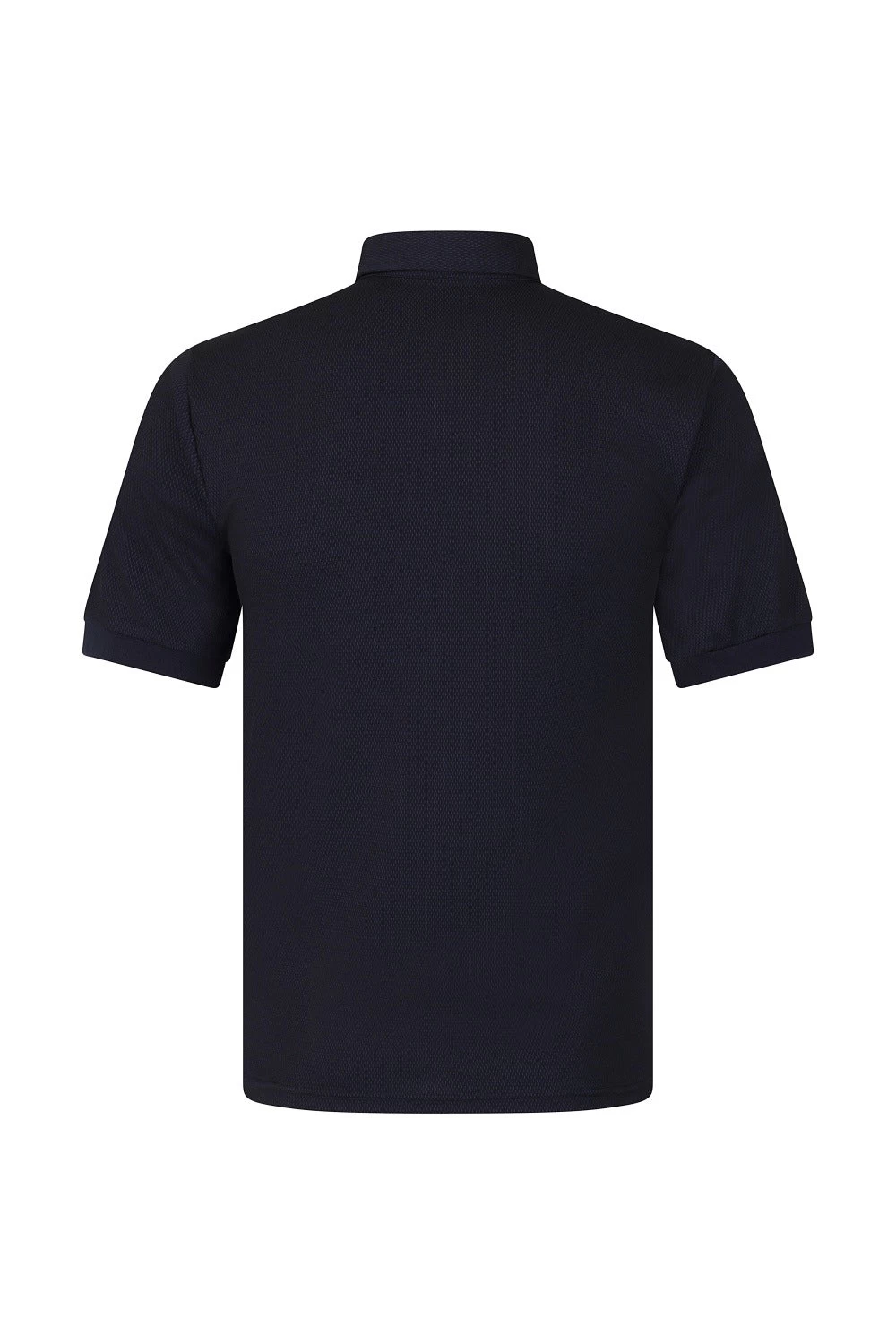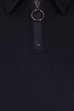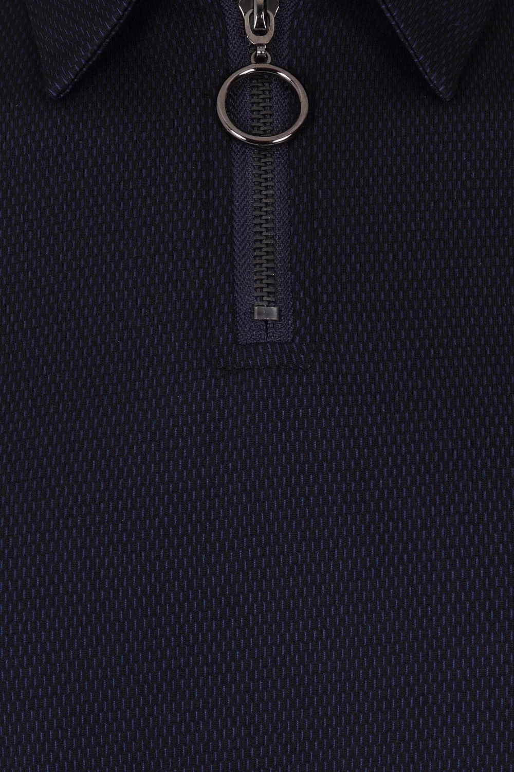 Ultra soft black and lightweight goth polo shirt with a dark blue interior. The shirt has a high-neckline with collar, short sleeves and it fastens with an O-ring zipper at the front. Perfect corporate goth attire for the office!