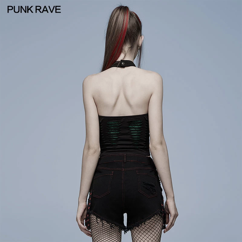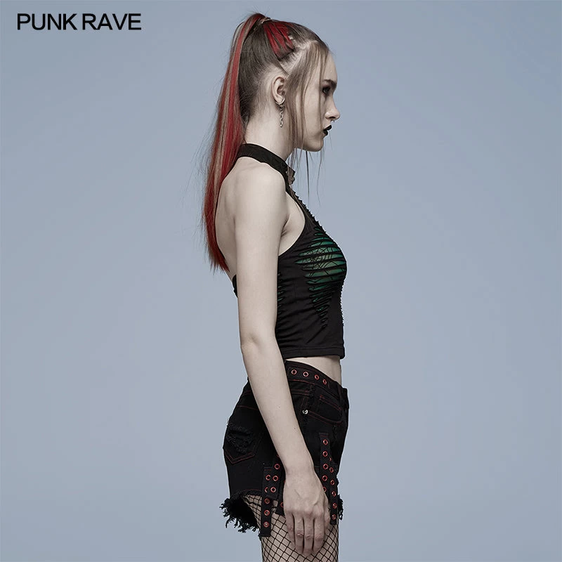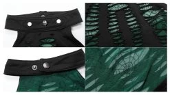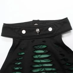 black and green, spiderweb mesh, shredded, halter top, skull and stud accent on the collar, cotton/spandex