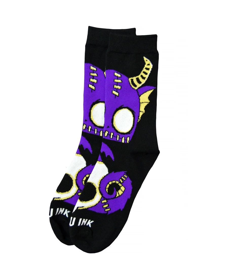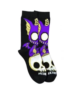 These Akumu Ink socks are comfortable knitted mid-calf socks. The hand-drawn artwork of a purple dragon sitting on his master’s skull long after he passed.
