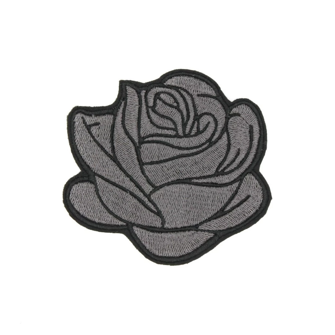Large Gray and Black Rockabilly Rose Iron-On Embroidered Patch