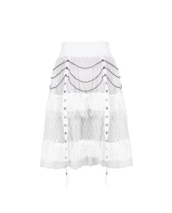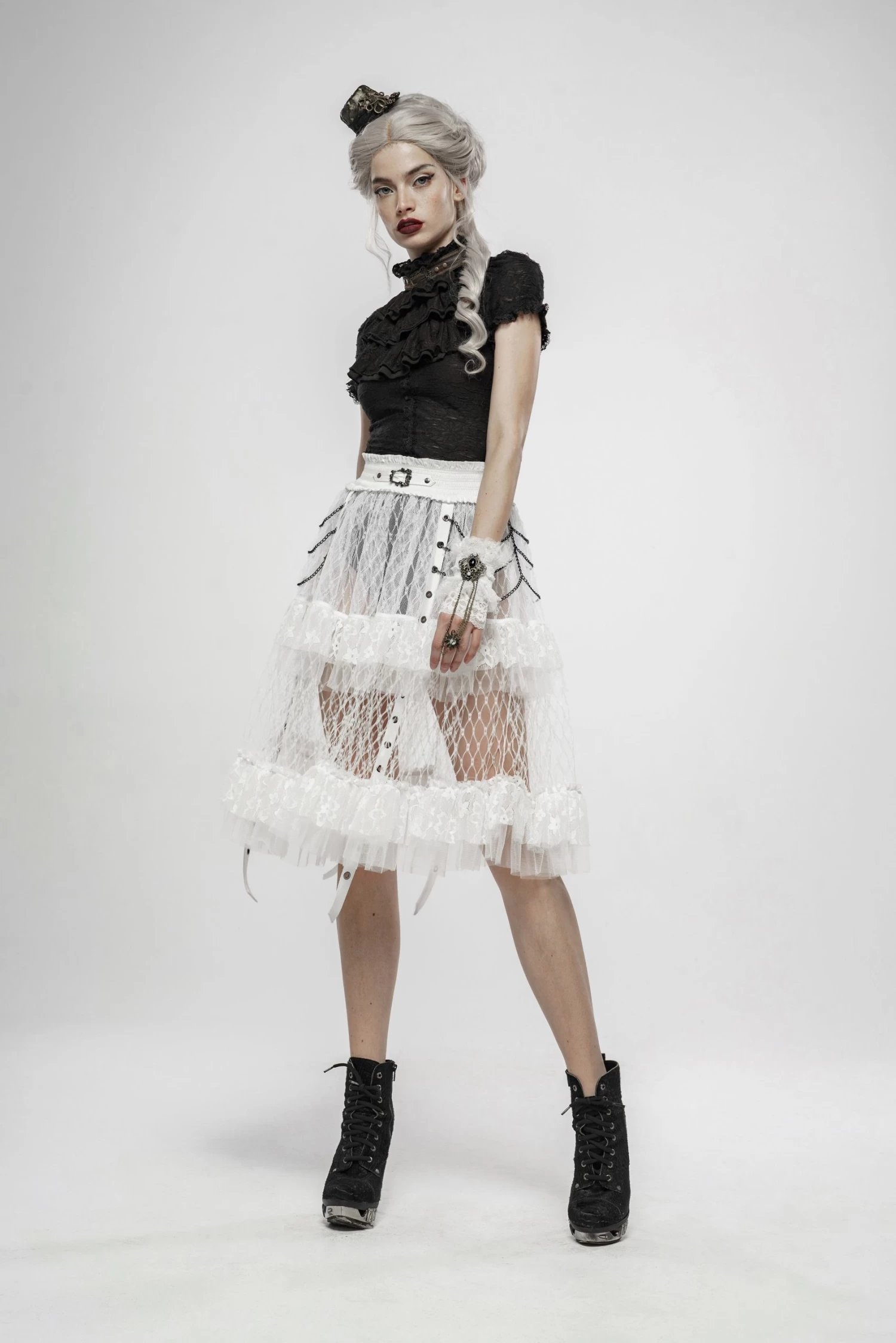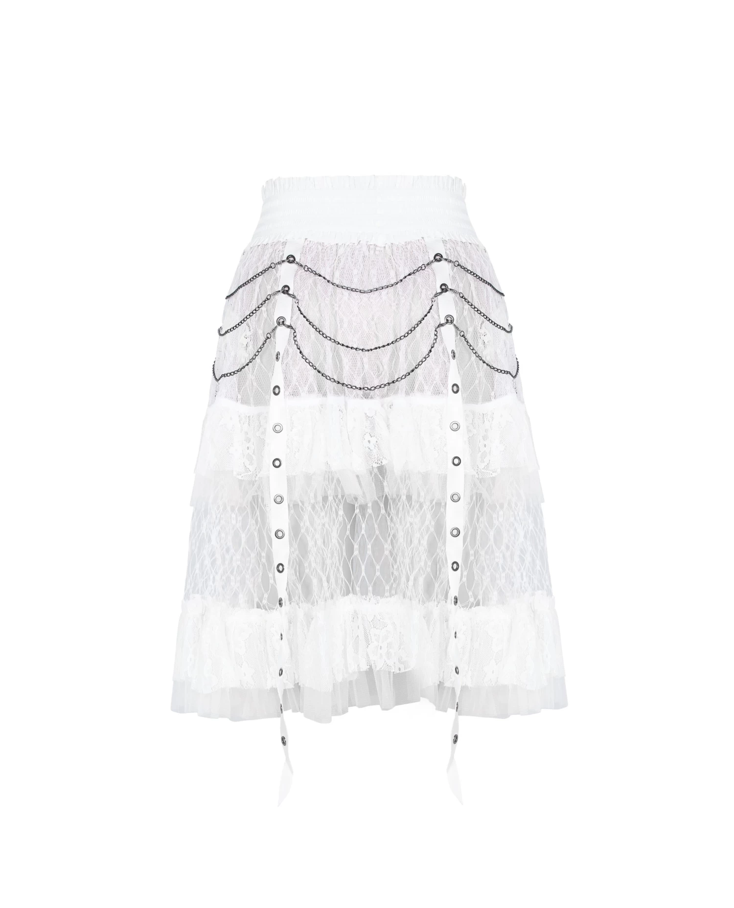 A long, high-waisted, multilayered mesh skirt by Punk Rave. Features wide mesh with ruffle, chains, and strap accents.