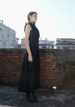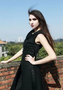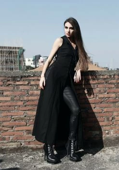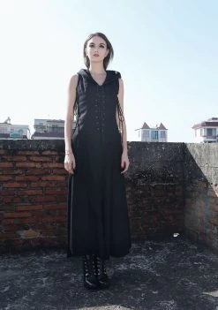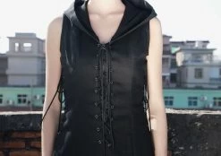 Long gothic jacket with hood, featuring lacing on the front and on the sides and a zipper in the back.
