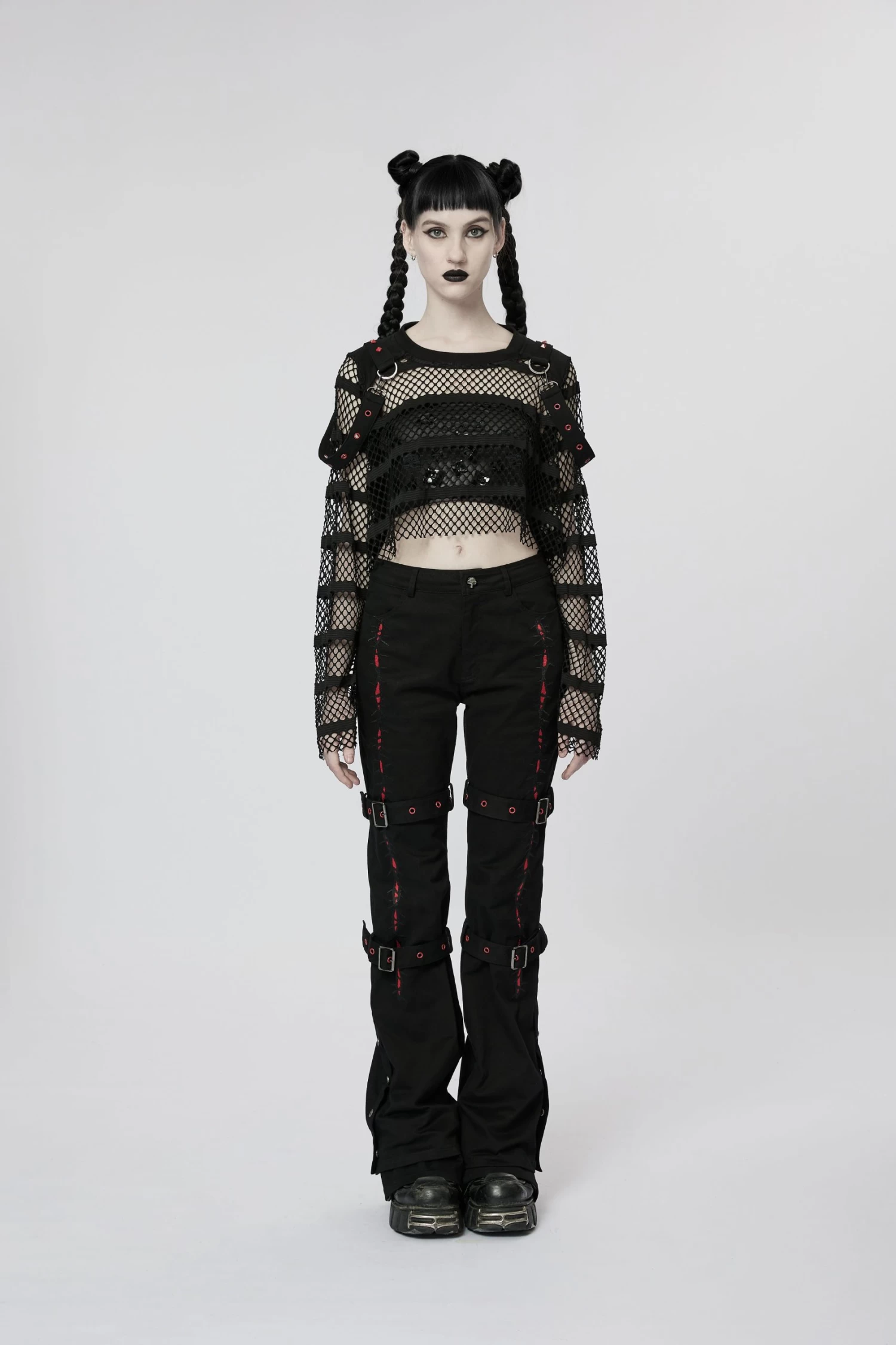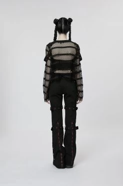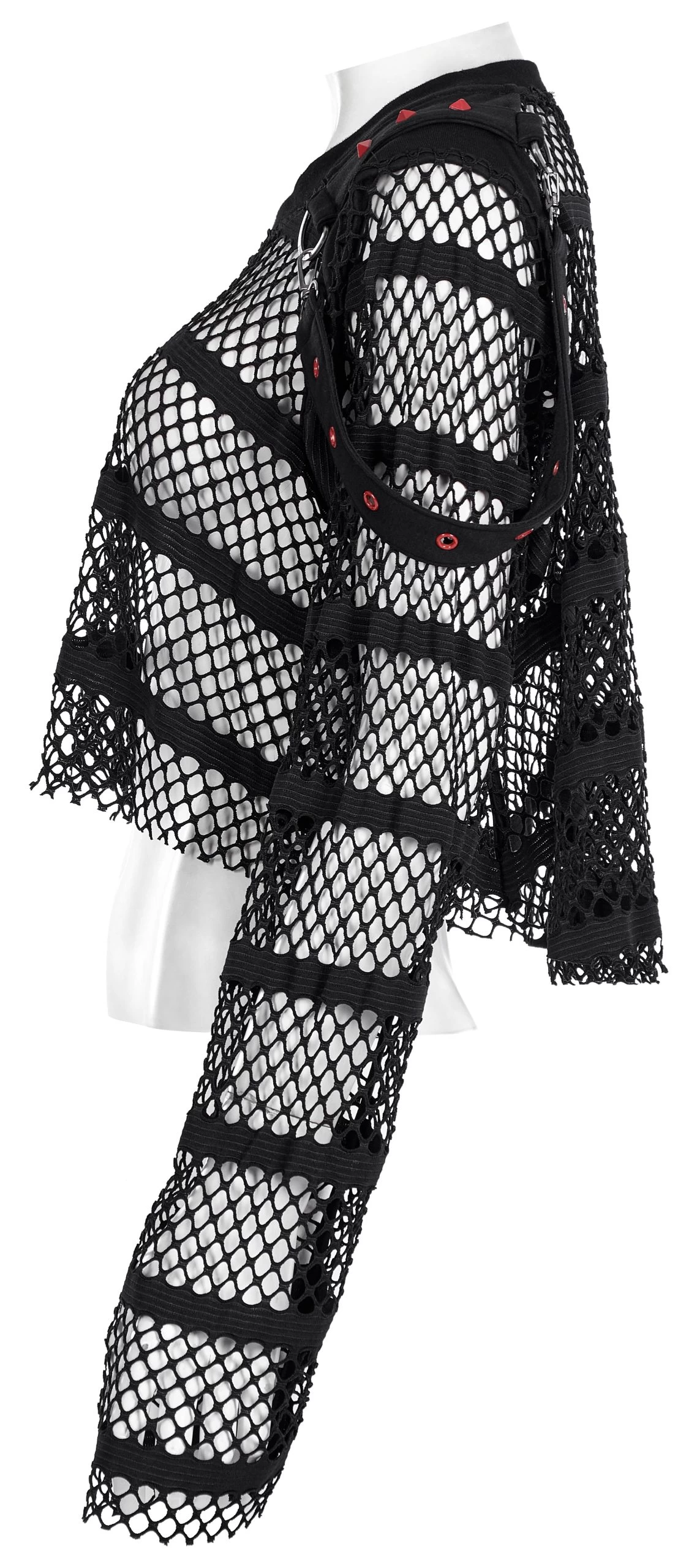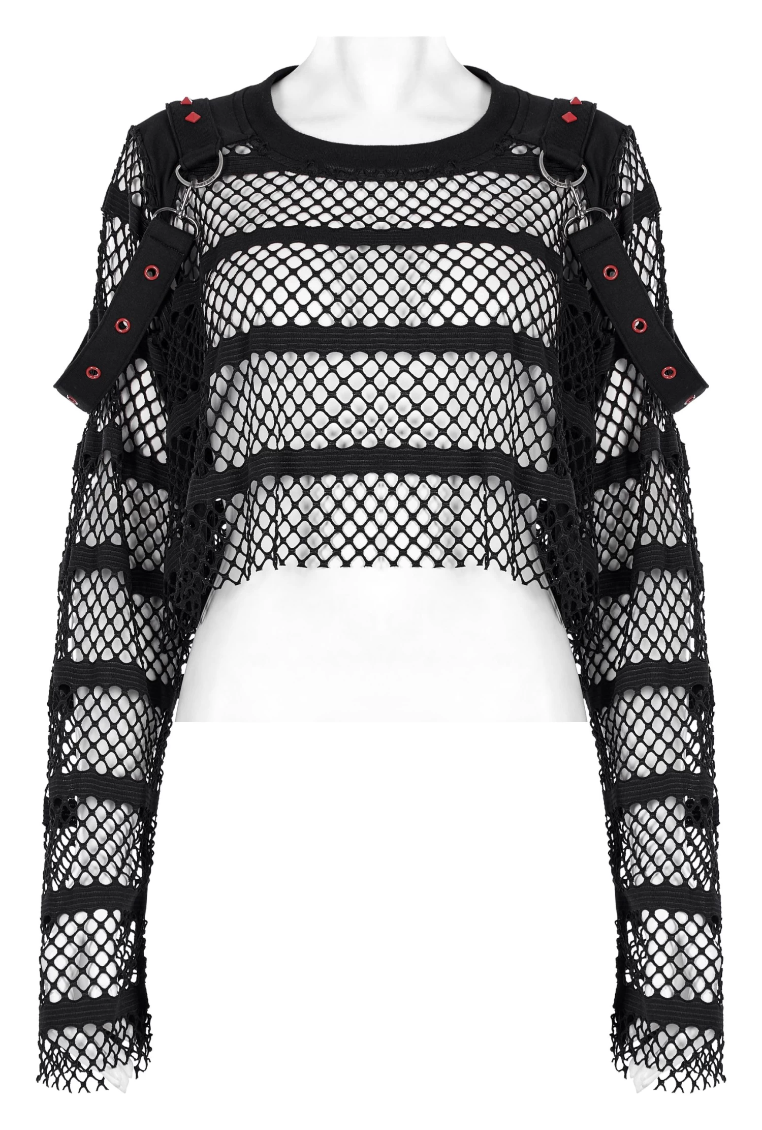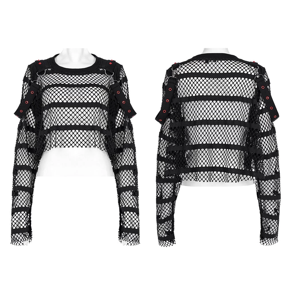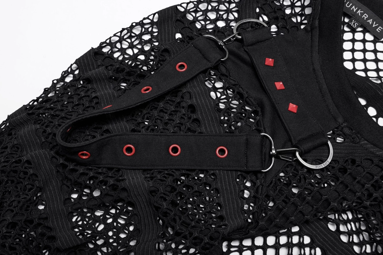 Made of an elastic mesh and spliced with an elastic knit for the shoulder, the loose crop top design encourages you to take a leap without sacrificing style. Decorated with red rivets and eyelets on the shoulder loops, this daring and fearless top will take your look up a notch.