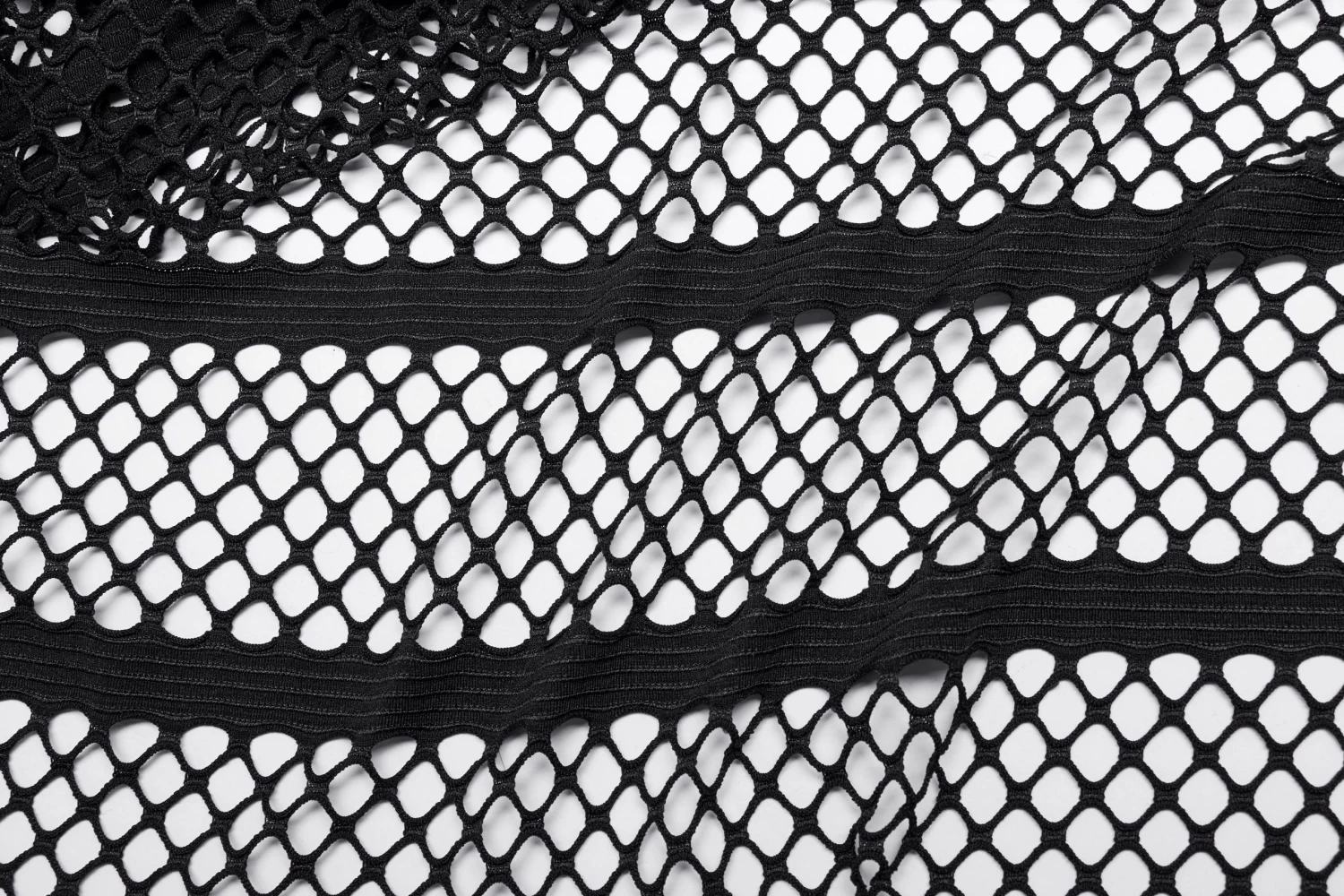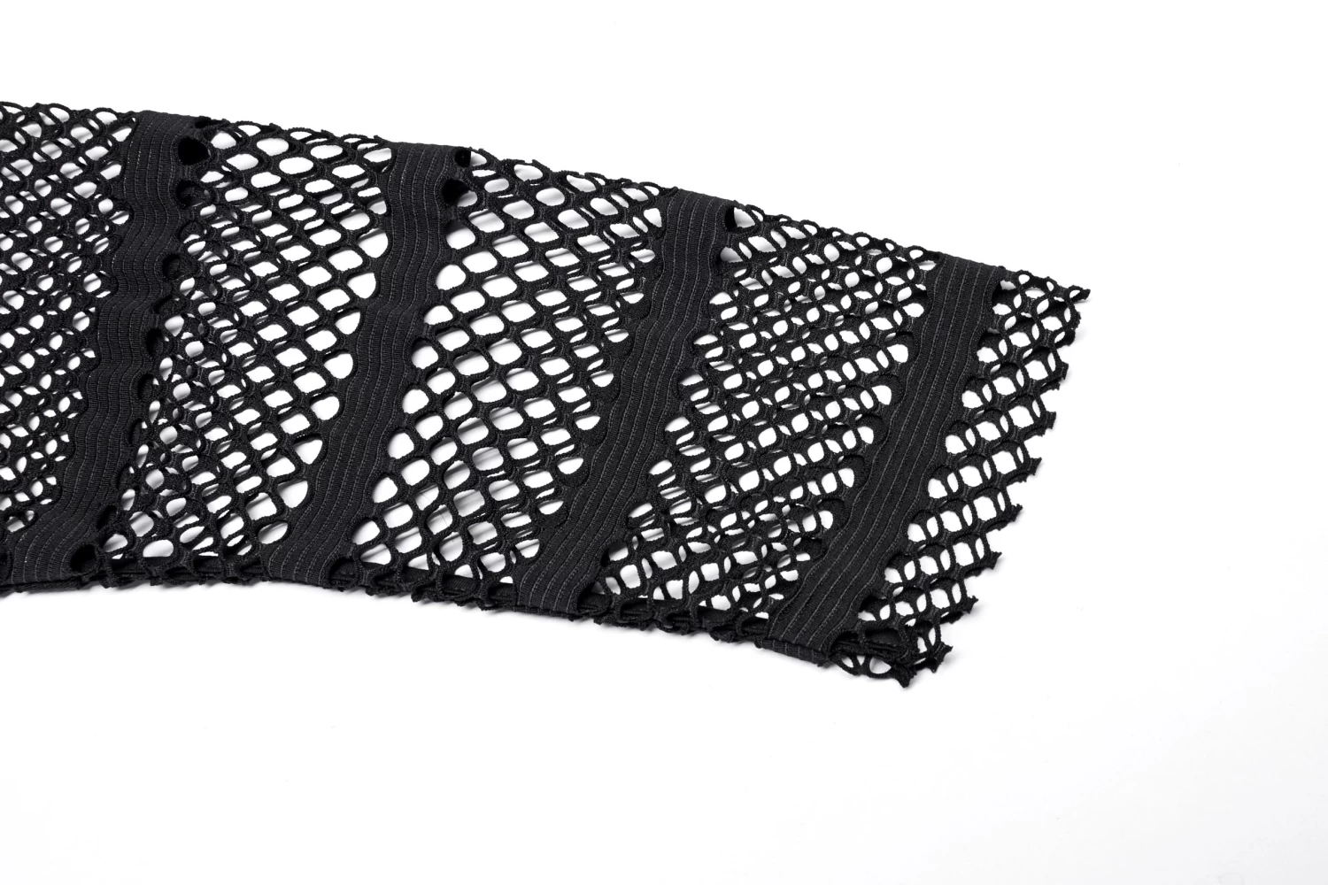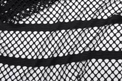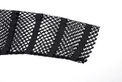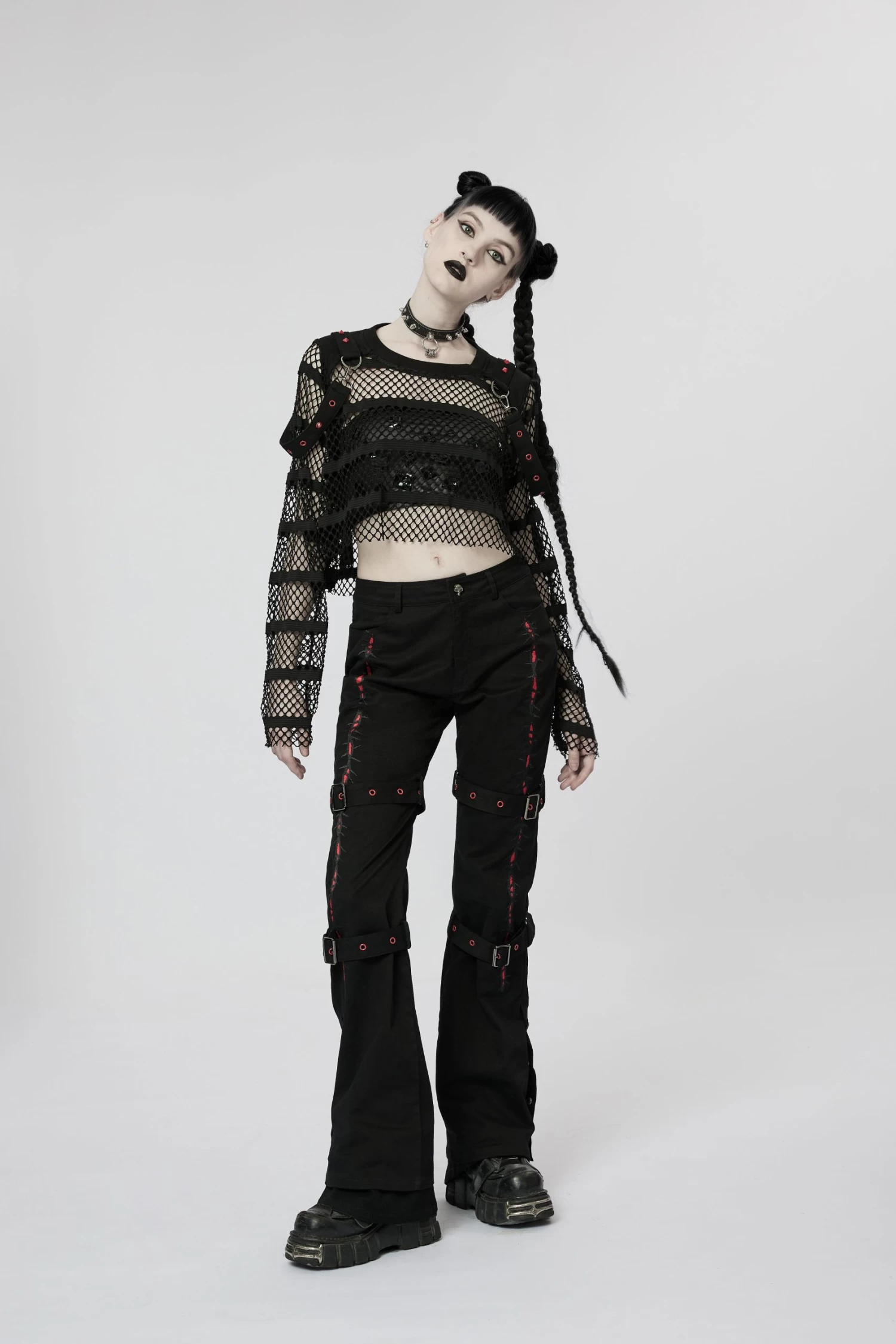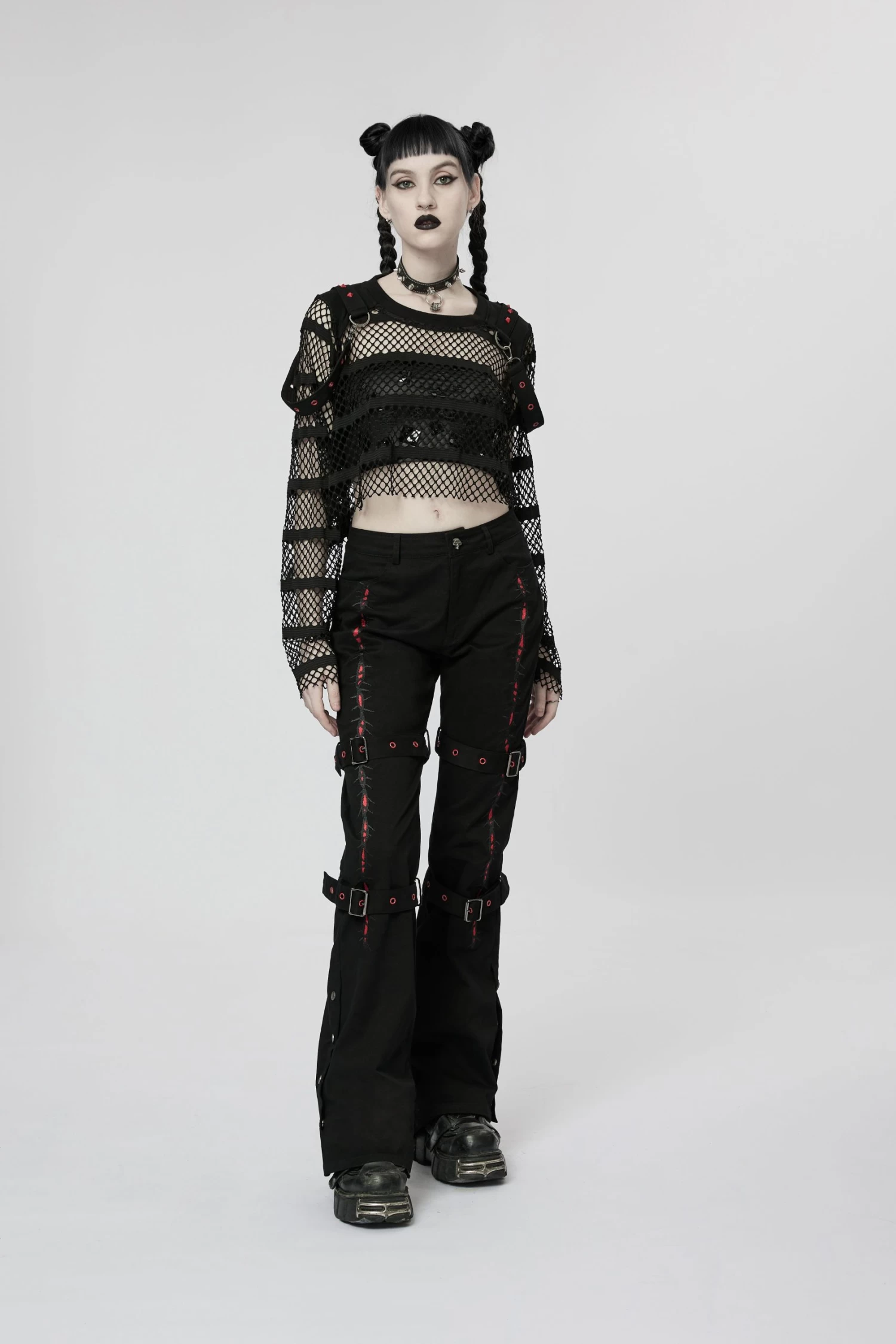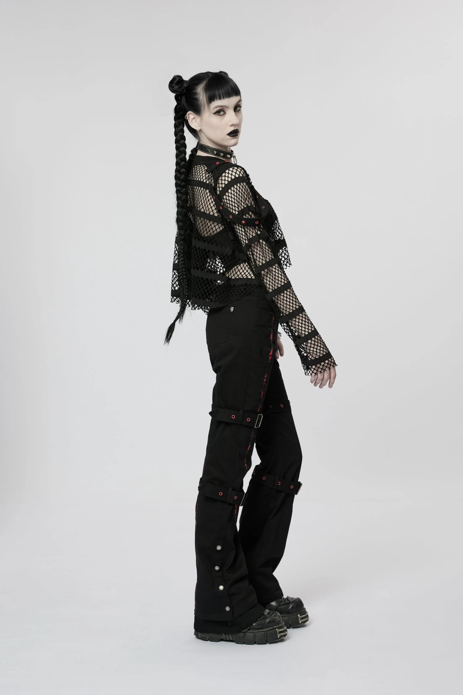Made of an elastic mesh and spliced with an elastic knit for the shoulder, the loose crop top design encourages you to take a leap without sacrificing style. Decorated with red rivets and eyelets on the shoulder loops, this daring and fearless top will take your look up a notch.