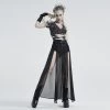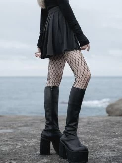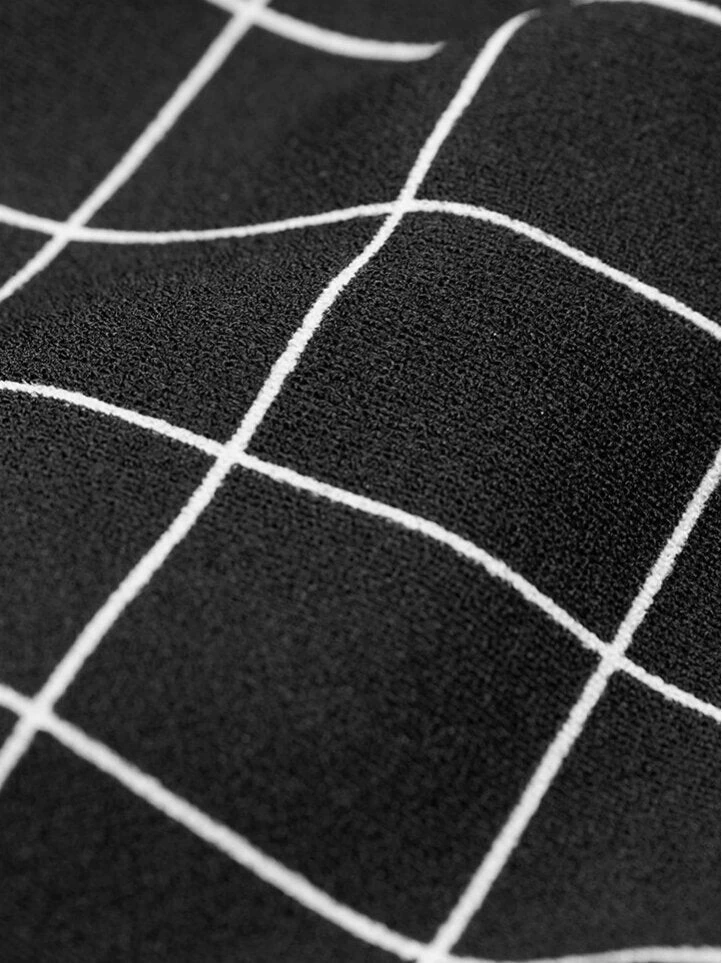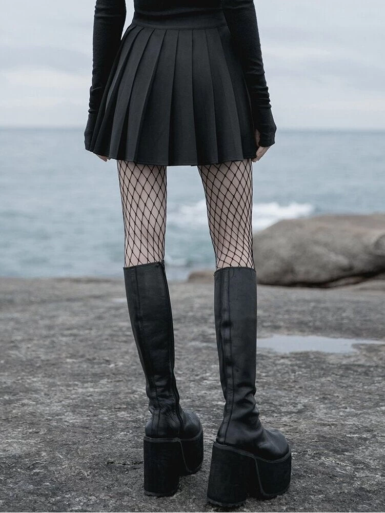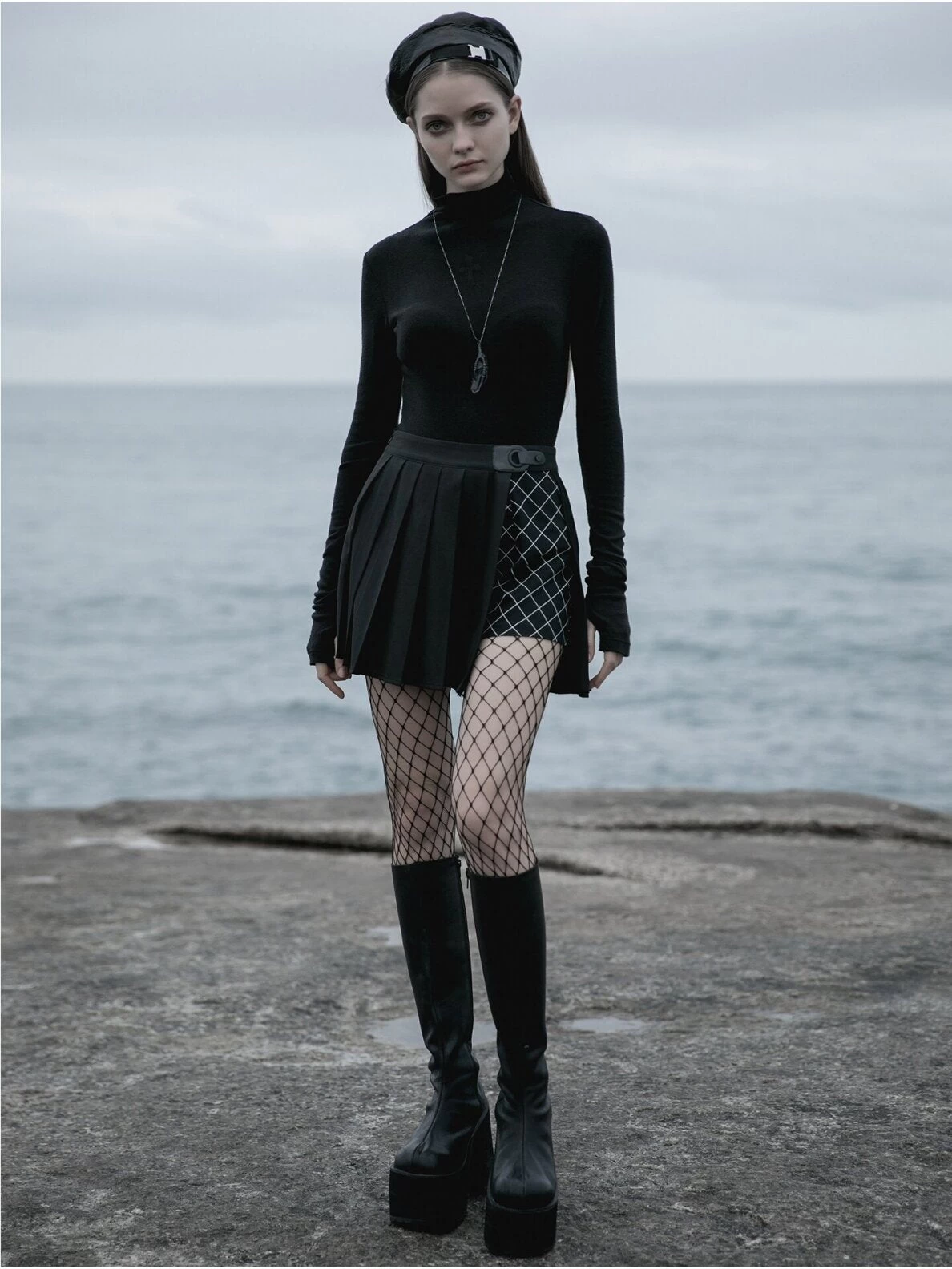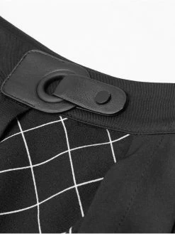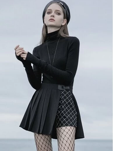 Pleated skirt with fake two-piece design, inside with shorts and inner black and white plaid fabric. PU loops design on waist.