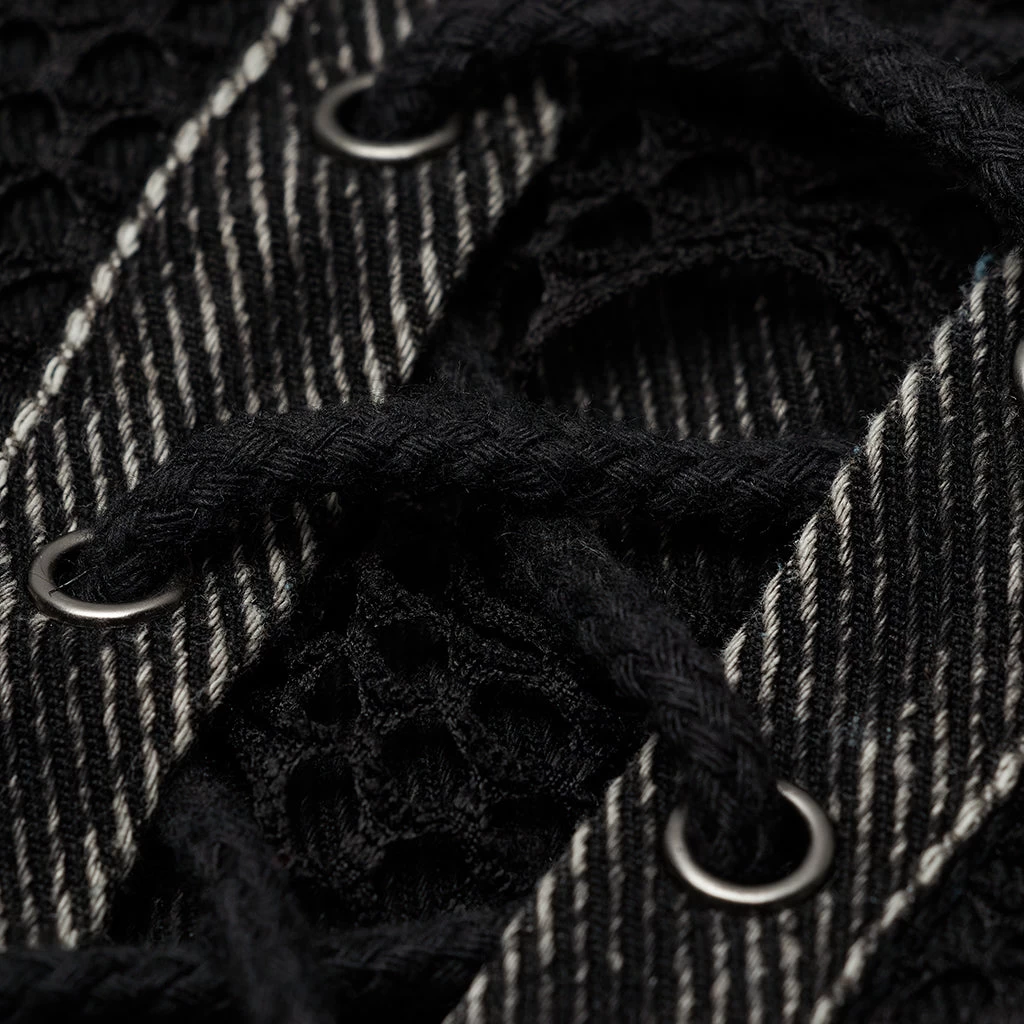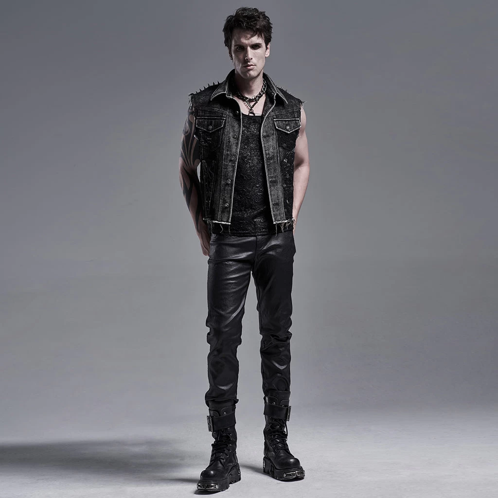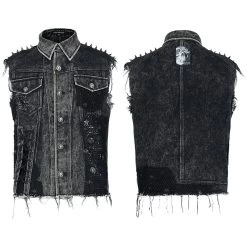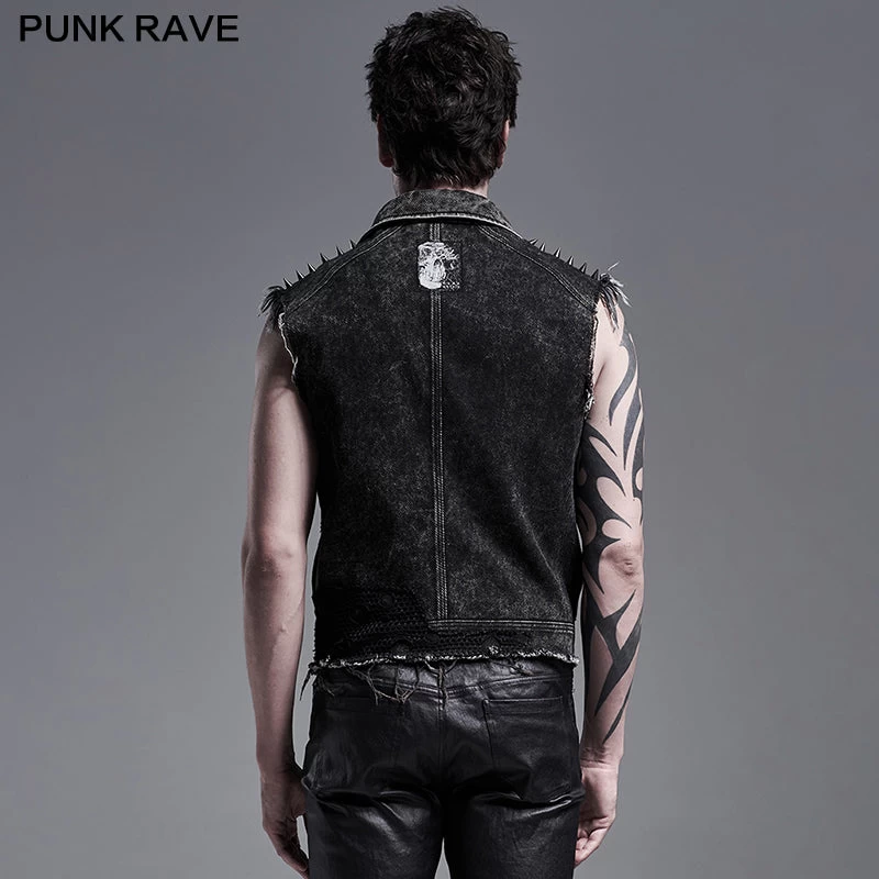 The Punk Decadent Vest is made from a twill denim fabric, which reflects the retro and decadent atmosphere through washing water and worn-out design details. 2. The front piece on both sides of the embroidery patch, broken mesh cloth patch and spikes on the shoulders.
