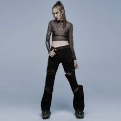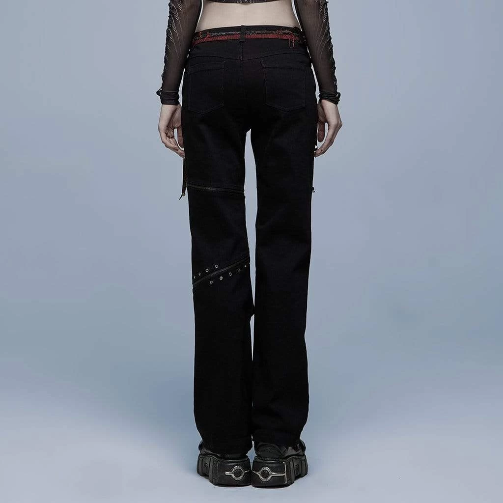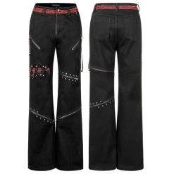 Slim fit, black flared pants with grommets, working zipper accents, and a skull button.