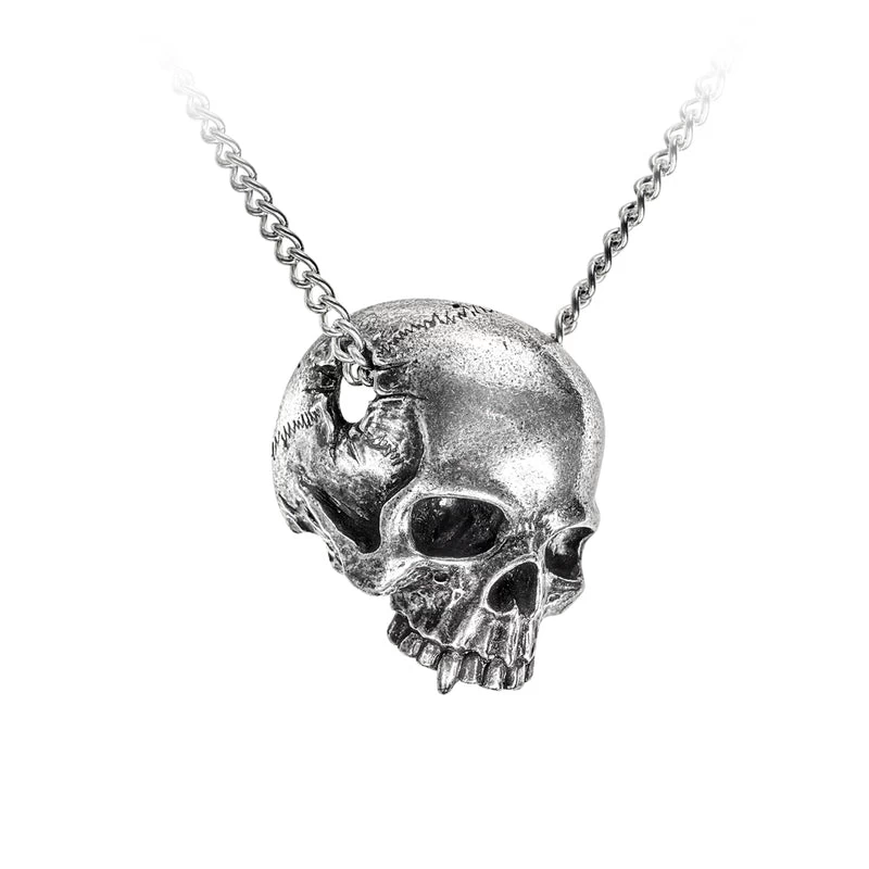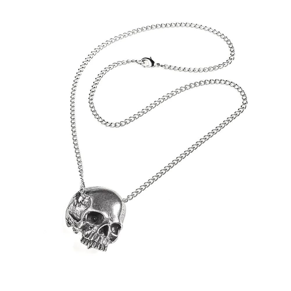 A jawless human skull, (with a suspiciously vampiric canine tooth), in ¾ view with a large temporal perforation, through which the pendant chain passes.