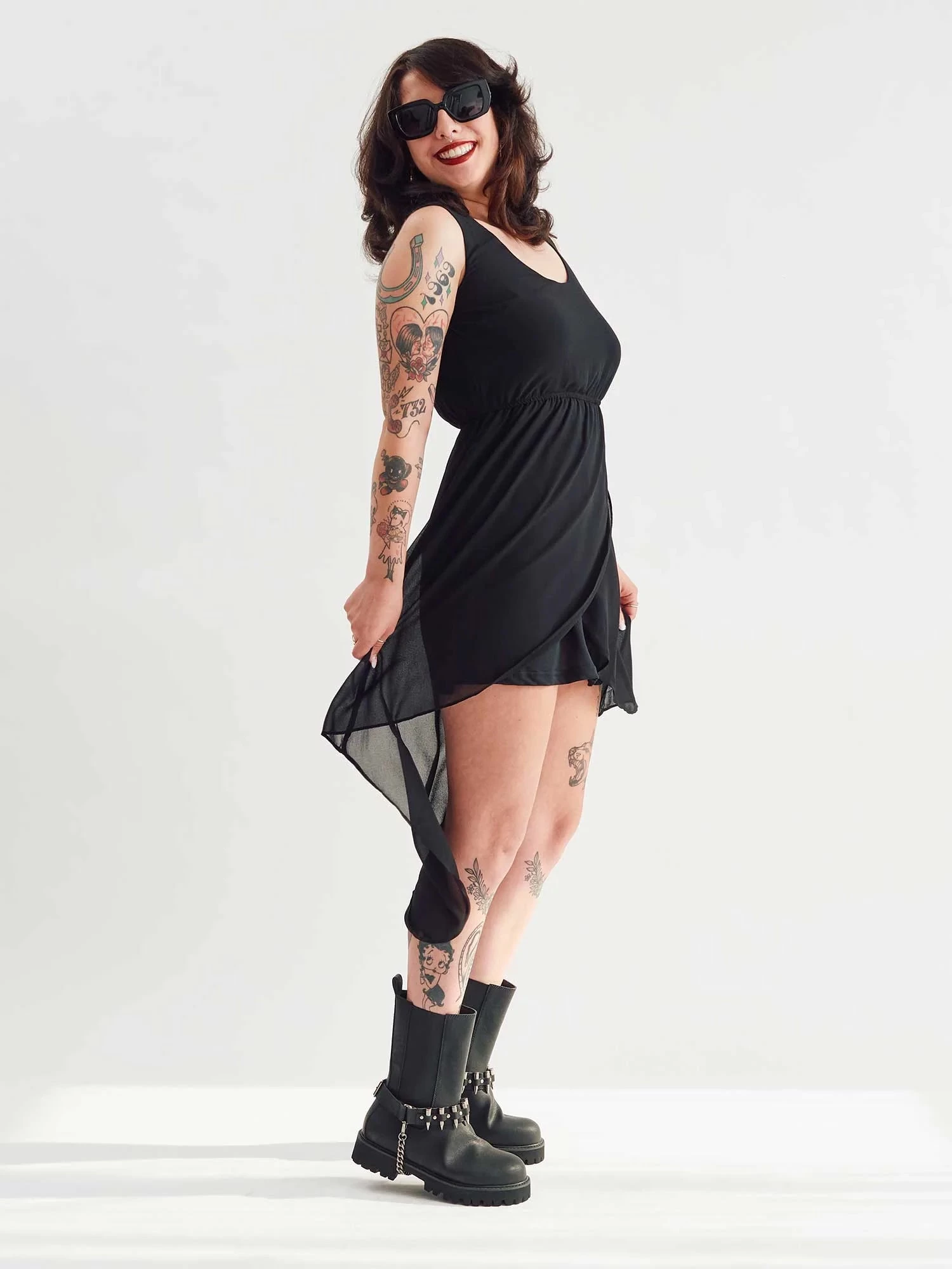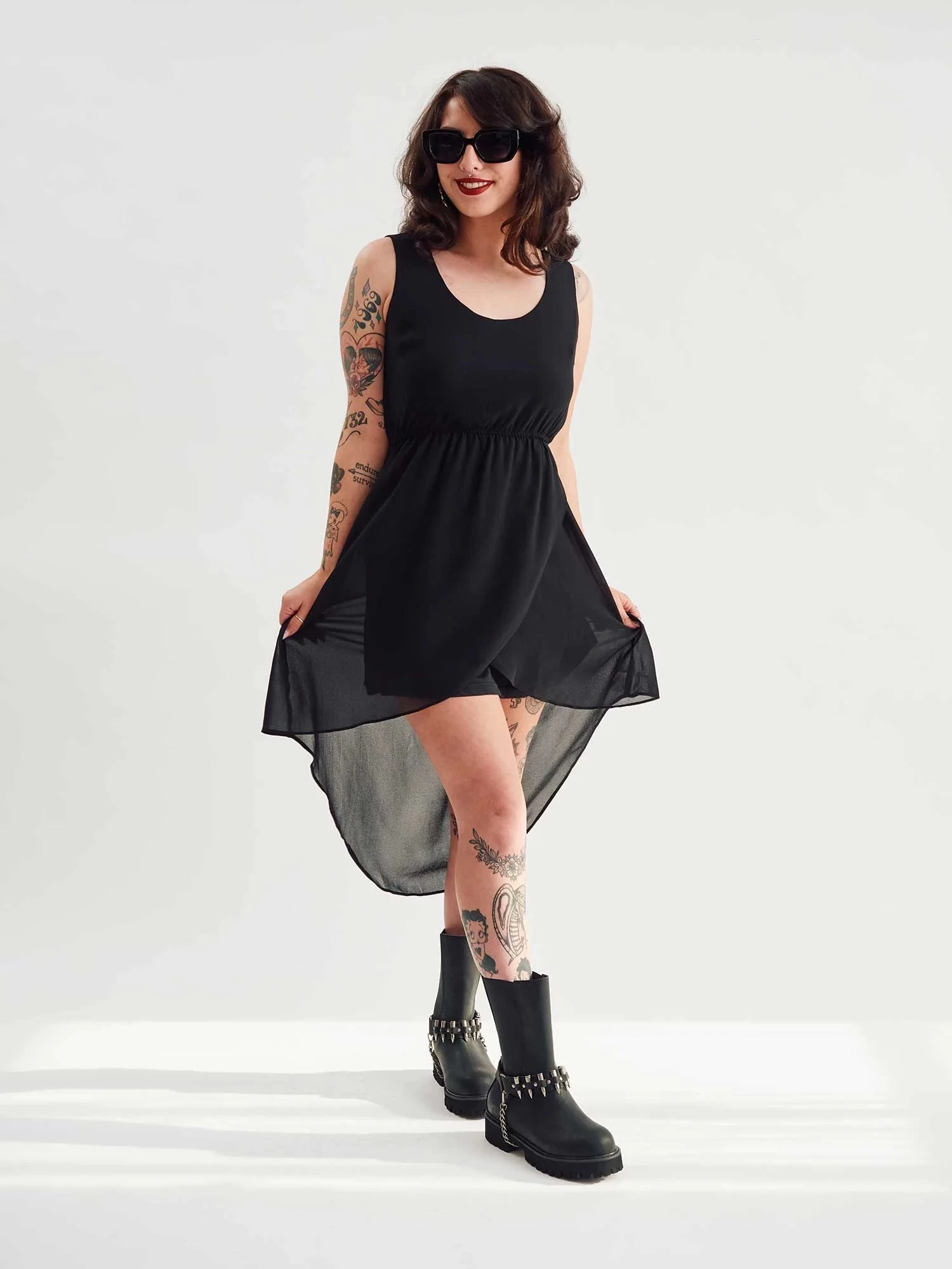 The Renee dress is the newest silhouette in the Sourpuss arsenal, and we’re in love! This easy to wear, flowy style features a hi-lo hem, an overlapped front skirt detail, and full lining. This dress has an elastic waist seam so there’s no need for a zipper! Pair it with your favorite boots for a perfect look.