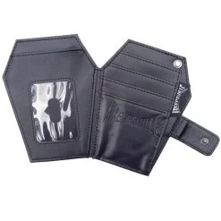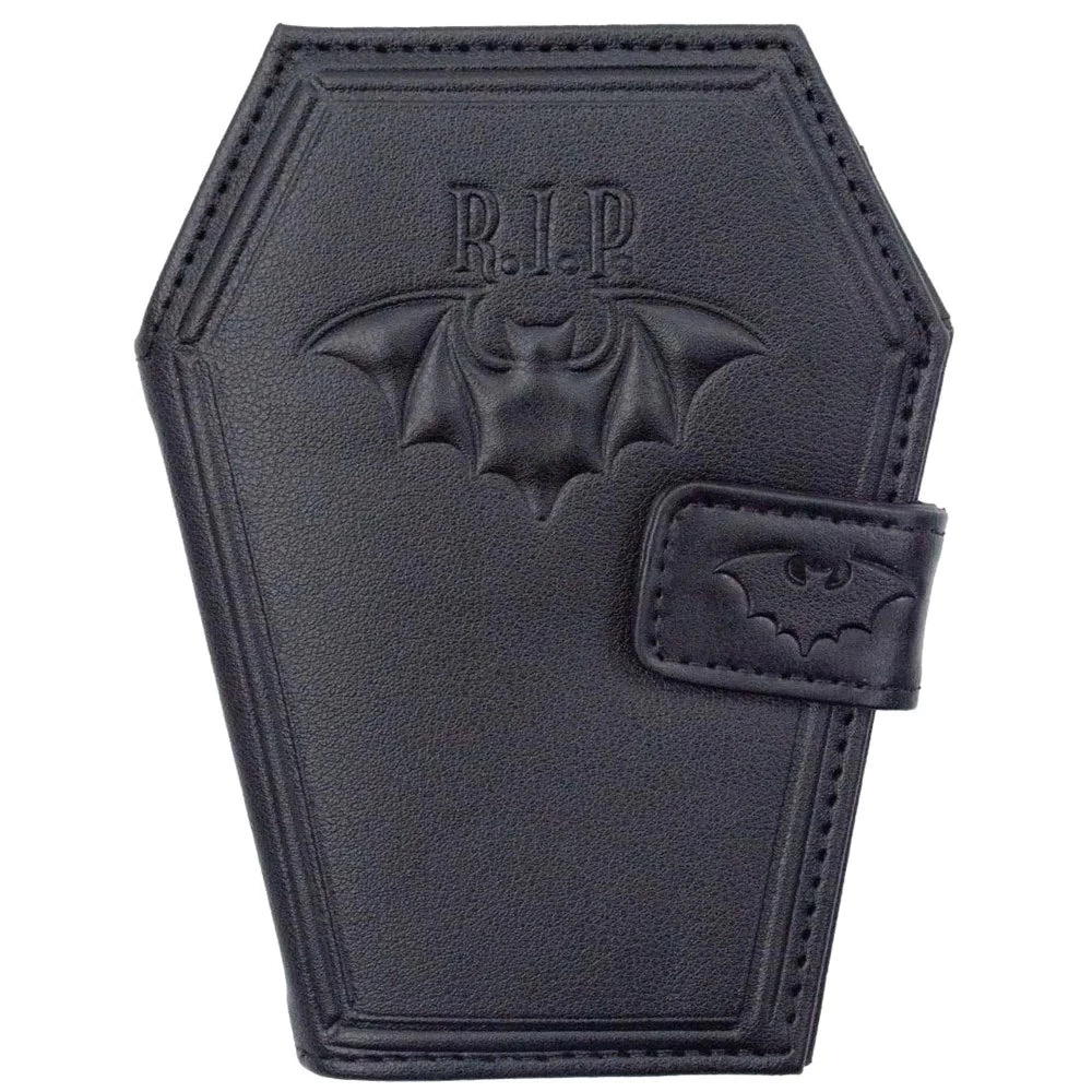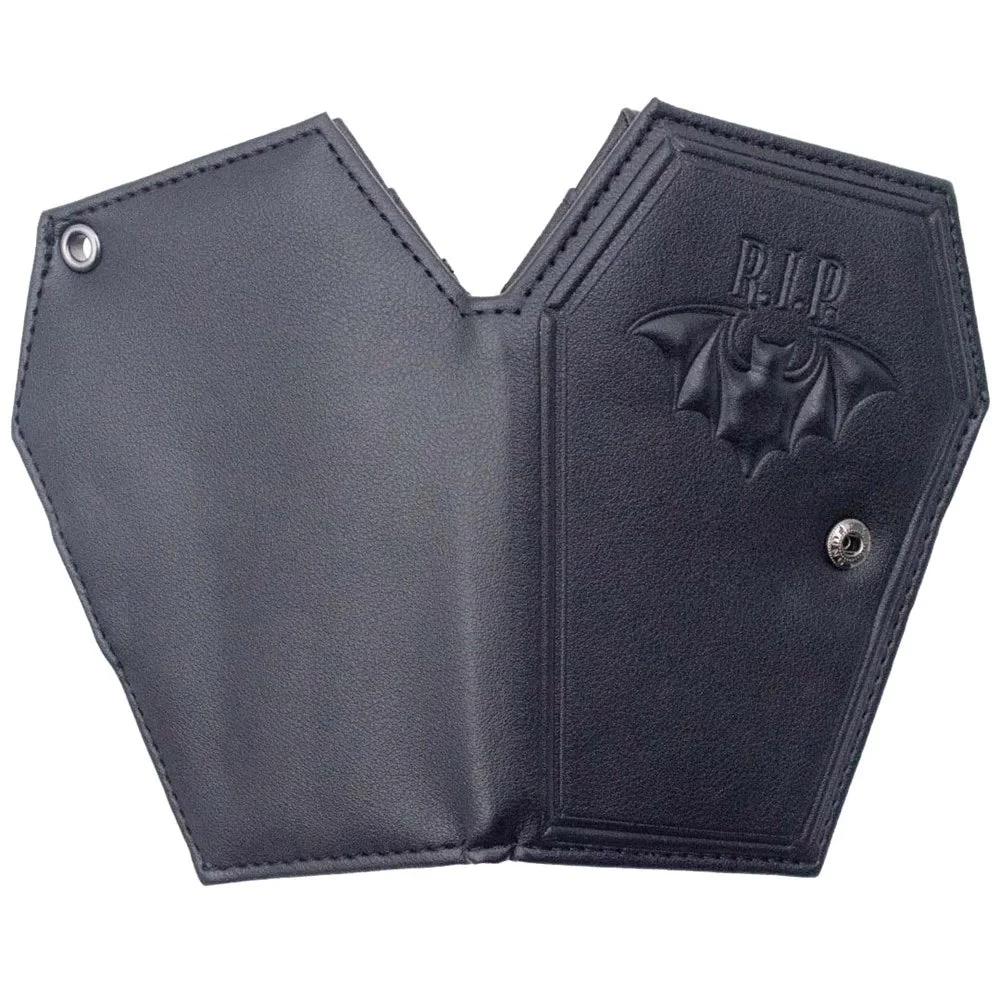 Satisfy your dark side with our RIP Bat embossed coffin wallet by Kreepsville! This gothic wallet features an embossed bat R.I.P. on the front and Kreepsville logo on the interior and spooky coffin shape. Its sturdy and soft faux vegan leather with snap fastener and eyelet wallet chain hole will ensure a secure and comfortable fit.