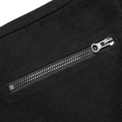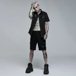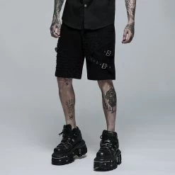 Ripped Buckle Splice Shorts are made from non-elastic denim fabric spliced with distressed broken hole fabric for tactile texture. Loose and comfortable Waistband with belt loops and high-grade metal skull head closure button with decorative broken hole textured segments and adjustable side belt buckle straps.