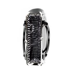 Shock me, baby! Make a truly electrifying entrance with our newest Shock Me Handbag in a stunning black on black retro design. Crafted from a high quality, high gloss, black vinyl, this 1960s inspired silhouette is complimented by the front bolt design, black glitter vinyl accents, metal feet and silver Sourpuss brand hardware. The top closes shut with a kisslock closure, while the interior reveals a fun black and white striped lining complete with pockets.