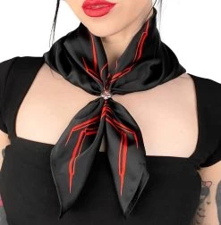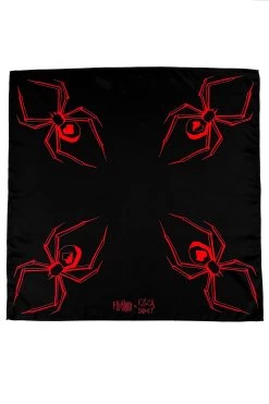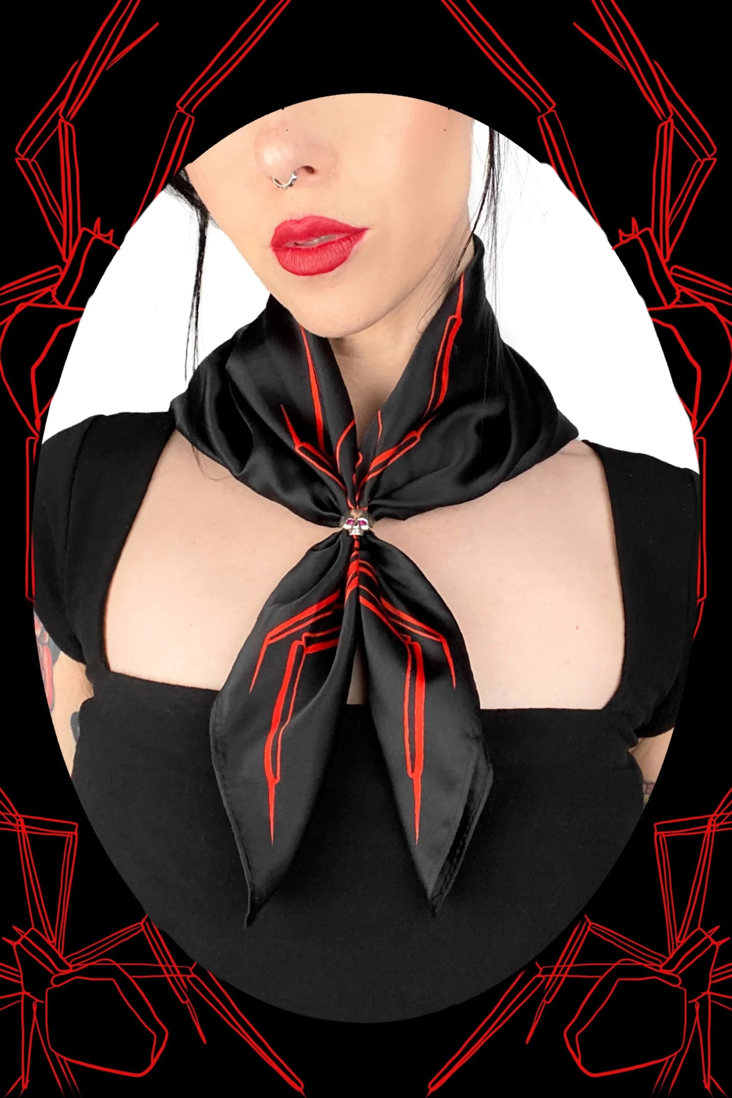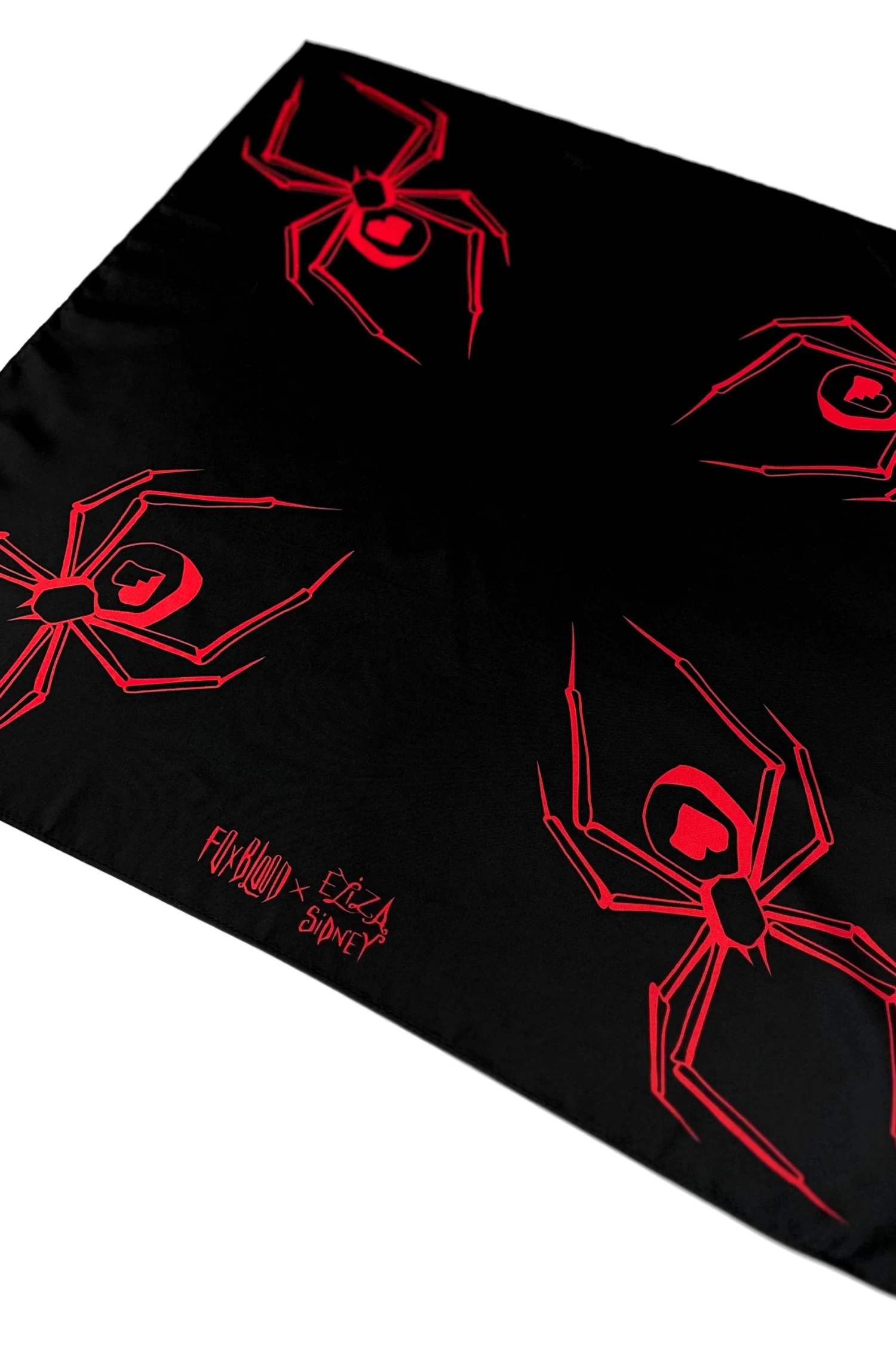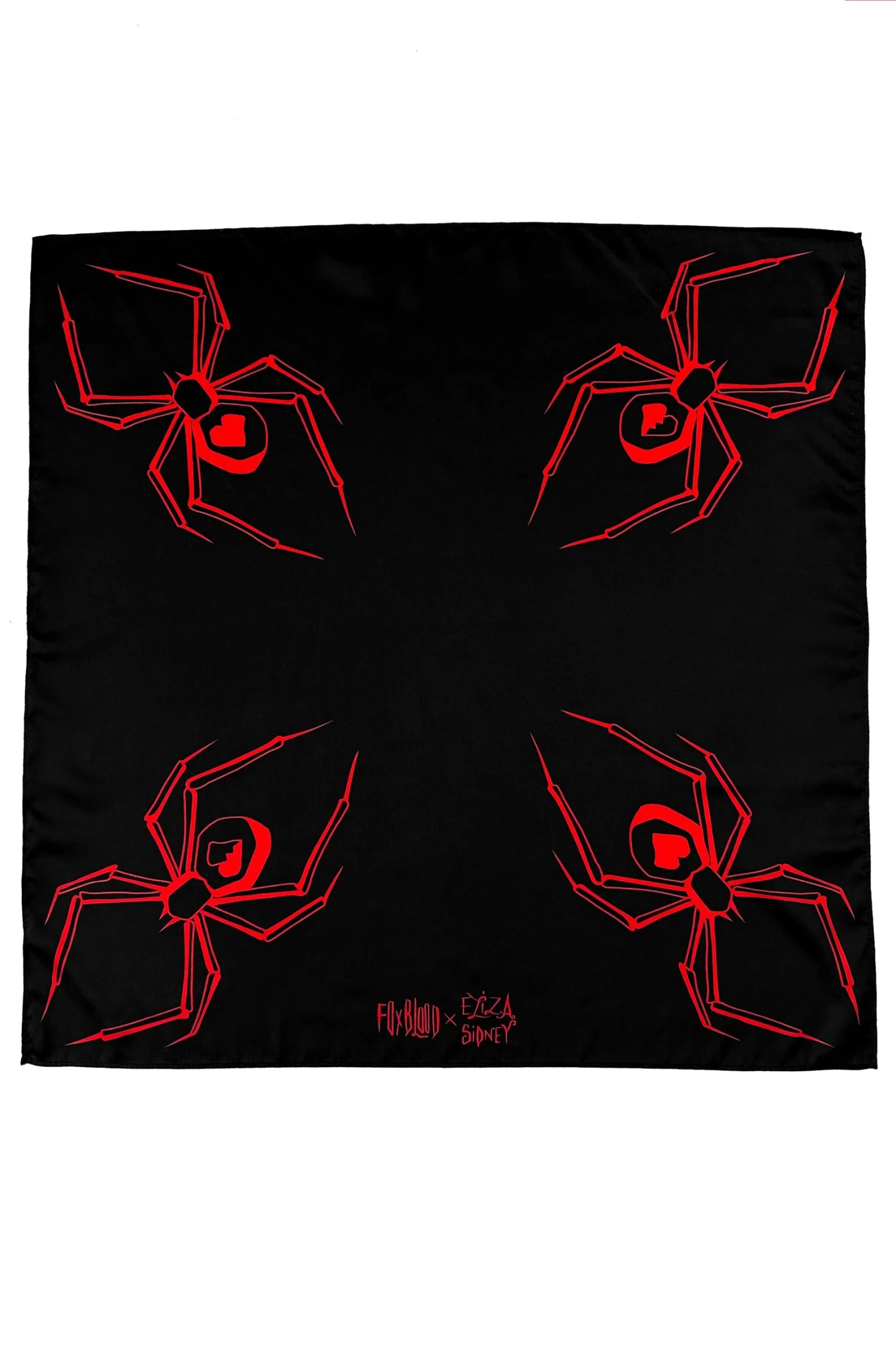 A super soft black square scarf with bold red spiders printed in each corner. Designed by artist by Eliza Sidney.