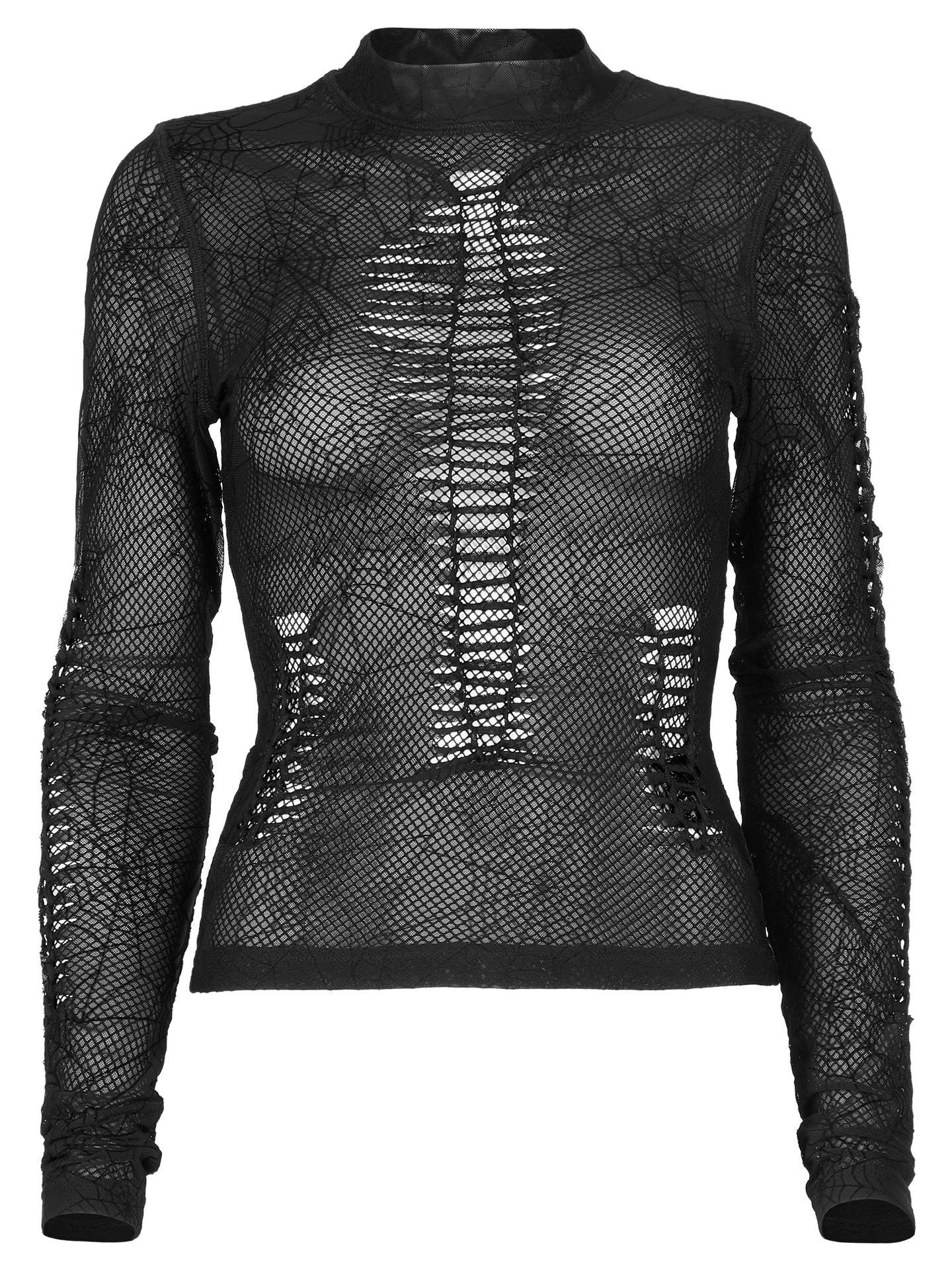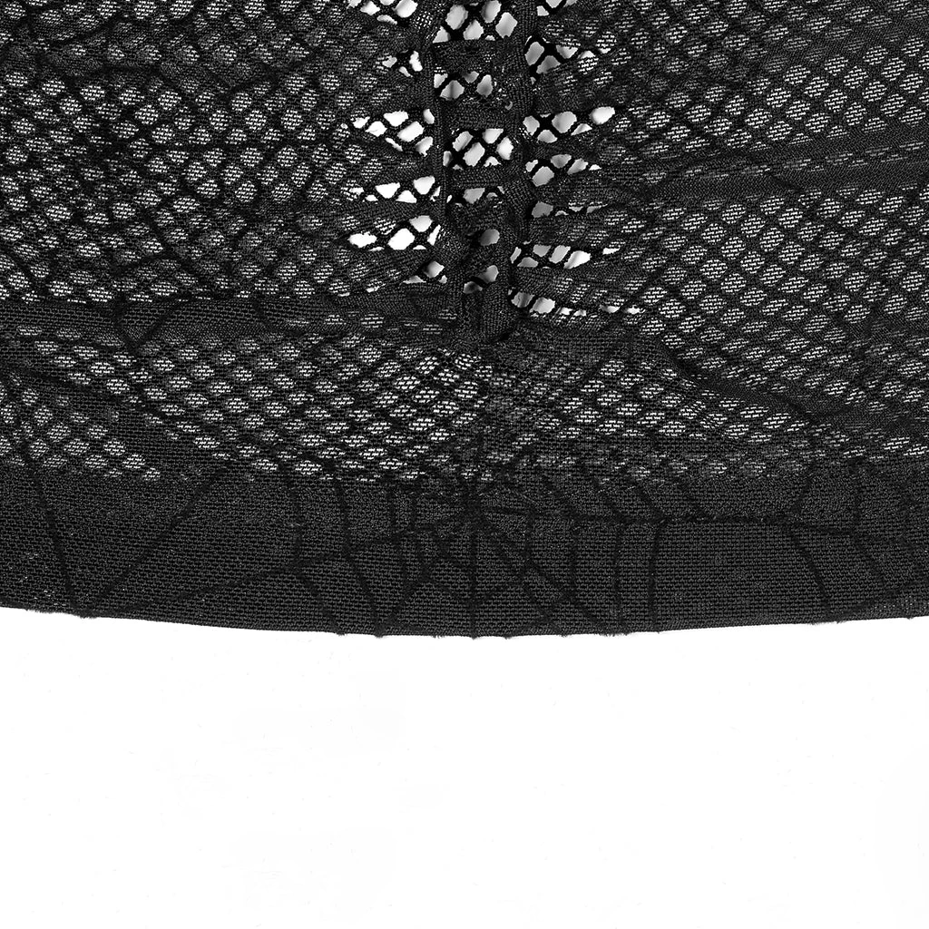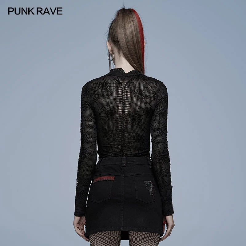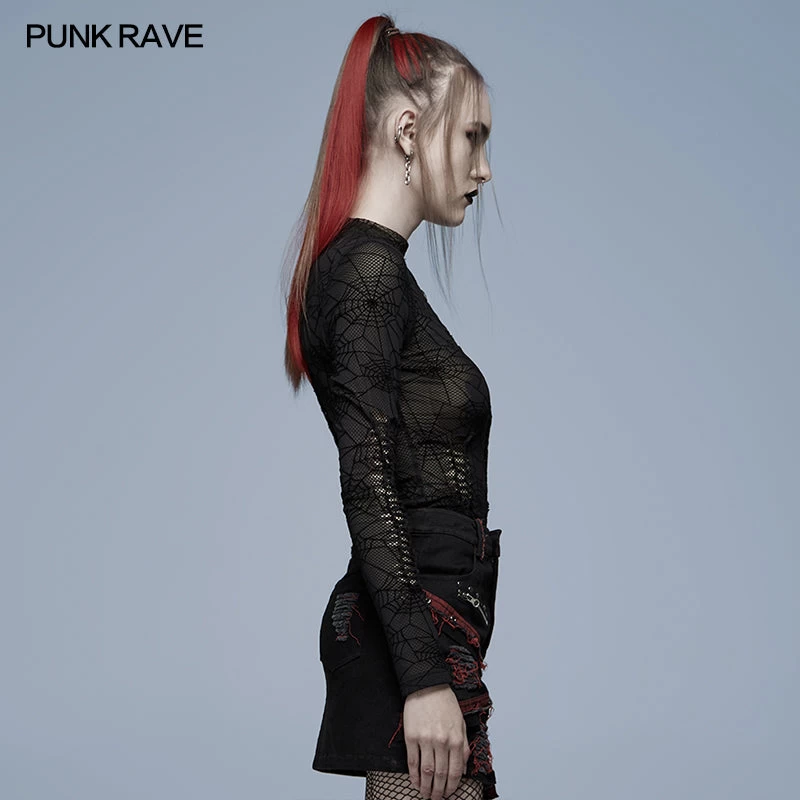 Black spiderweb mesh long sleeve top from Punk Rave. Features a gothic spiderweb mesh and textured fabric.