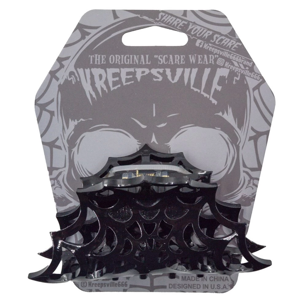 Kreepsville Spiderweb Hair Claw Clip Black. Put some scare in your hair with our eye-catching, super sturdy spring claw clips. Perfect for up do’s and lazy hair days! Made with black shiny acrylic. Designed by ghouls in the USA! Clip size: 4.5″ (11.43cm) x 2″ (5cm).