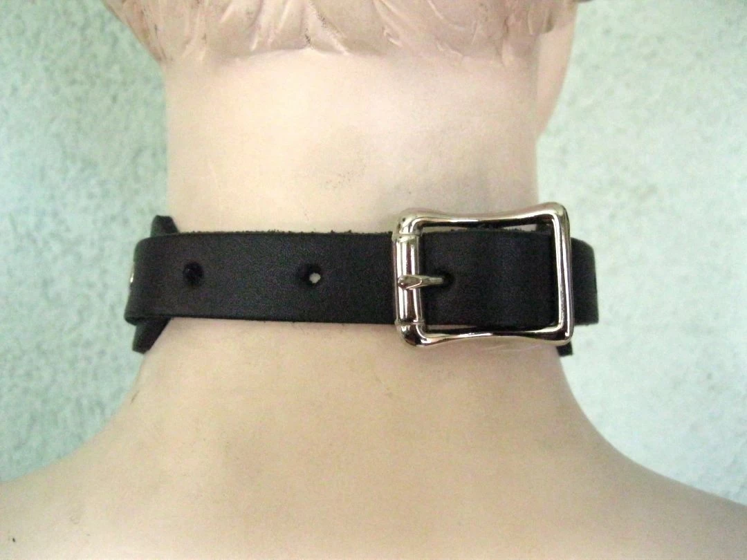 High quality leather bondage choker 1.25″ wide with one 1″ 0 ring and 1 1/4″ long spikes.