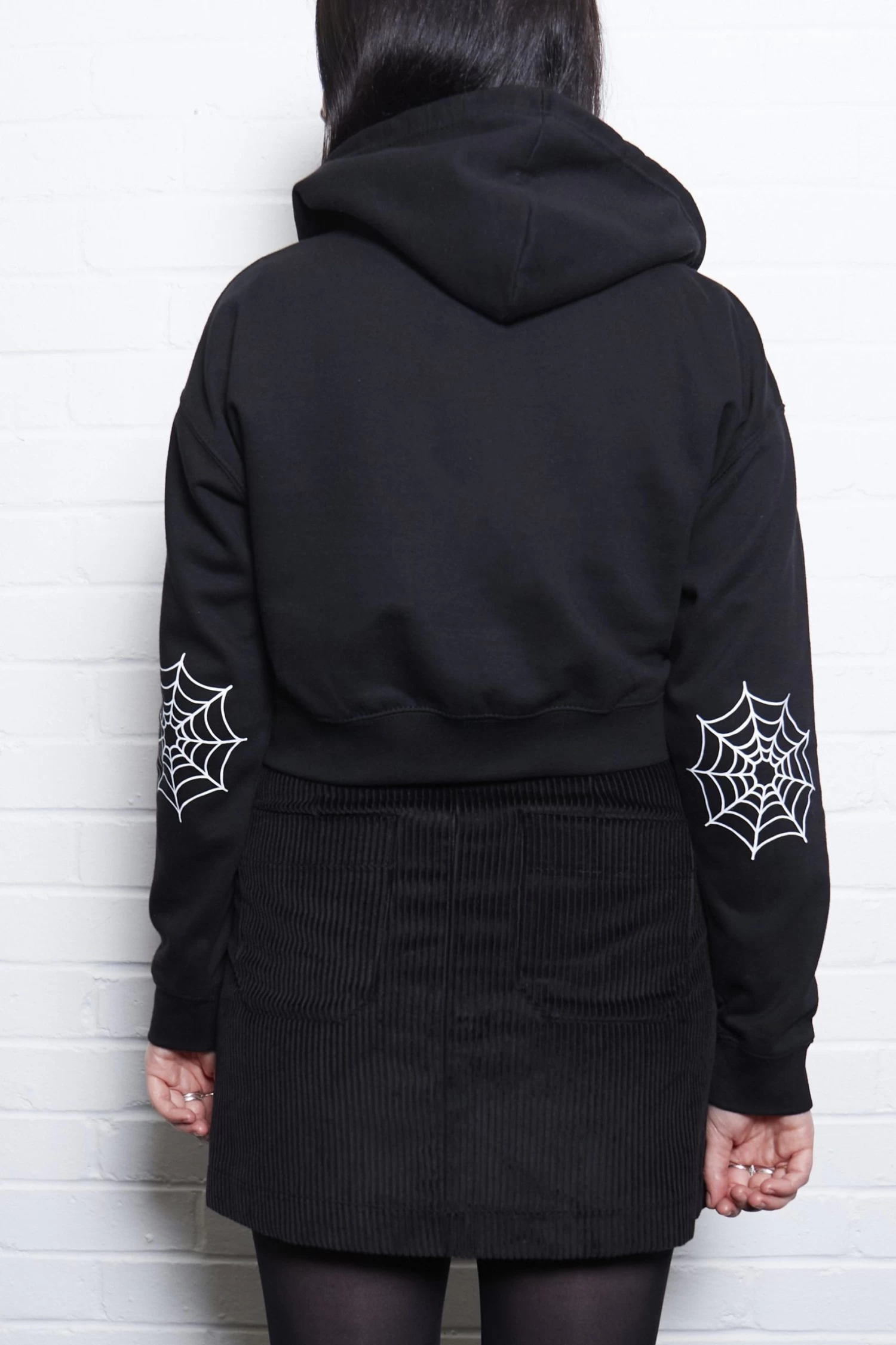 In a jet black hue; this hood is finished with contrasting white printed graphics in ode to our favourite widow friend alongside our signature cobwebbed elbows.
