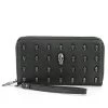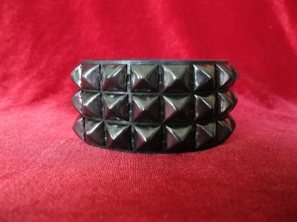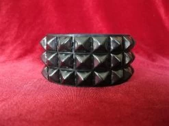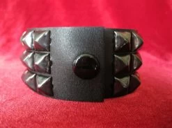 Three row pyramid wristband on black leather with bright nickel 1/2″ pyramids.1.75″ wide by Ape Leather. Choose from silver or black.