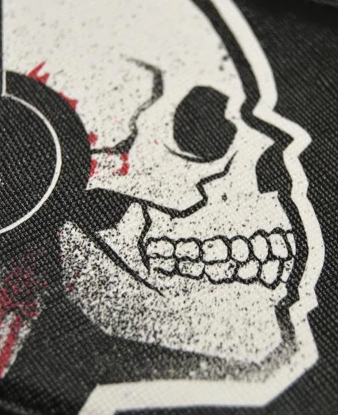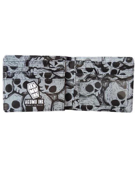 This is a bi-fold wallet with skull pattern on the inside of the wallet. The design featured on this wallet is Tone Death, a skeleton wearing headphones turned up so loud his ears are bleeding.