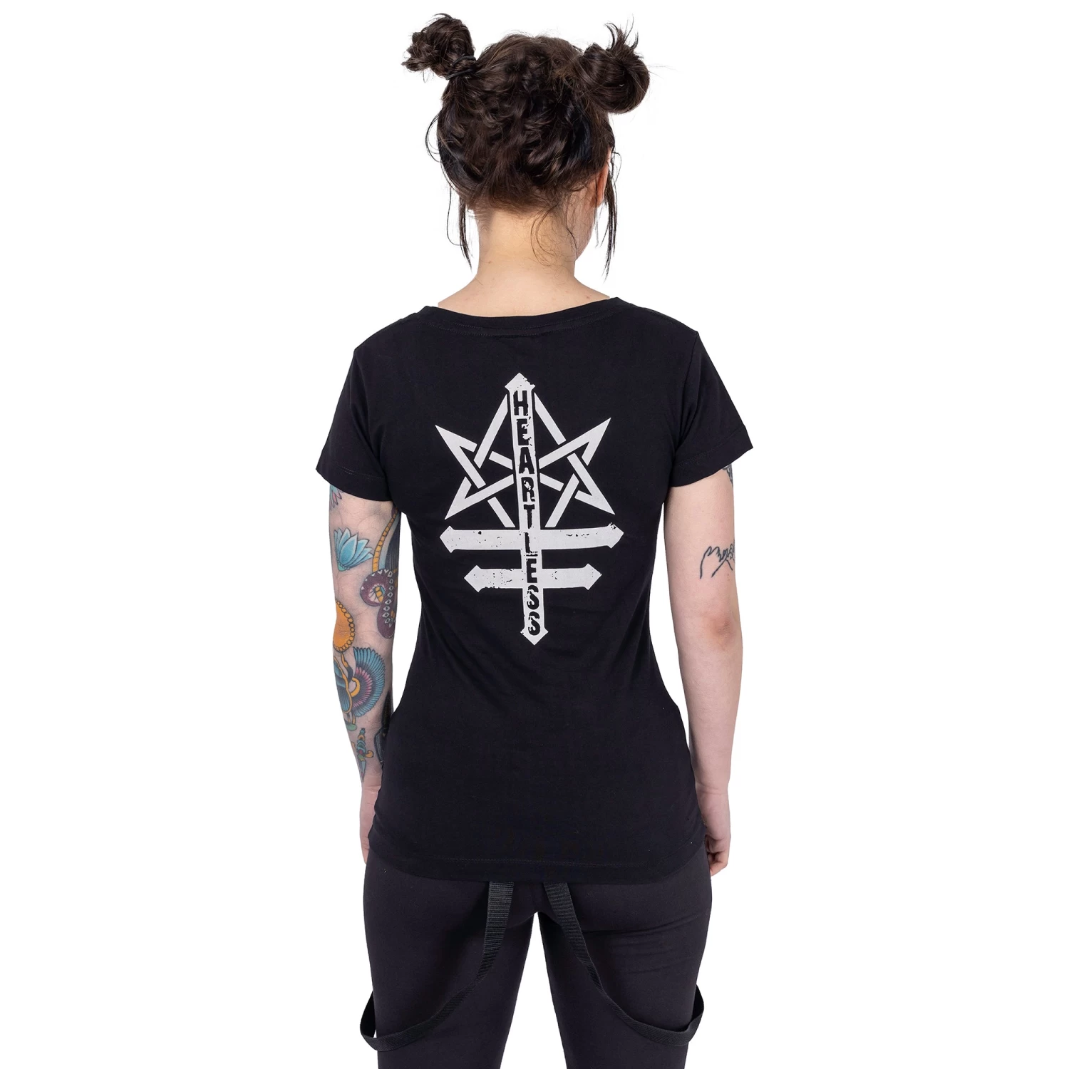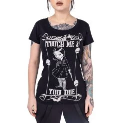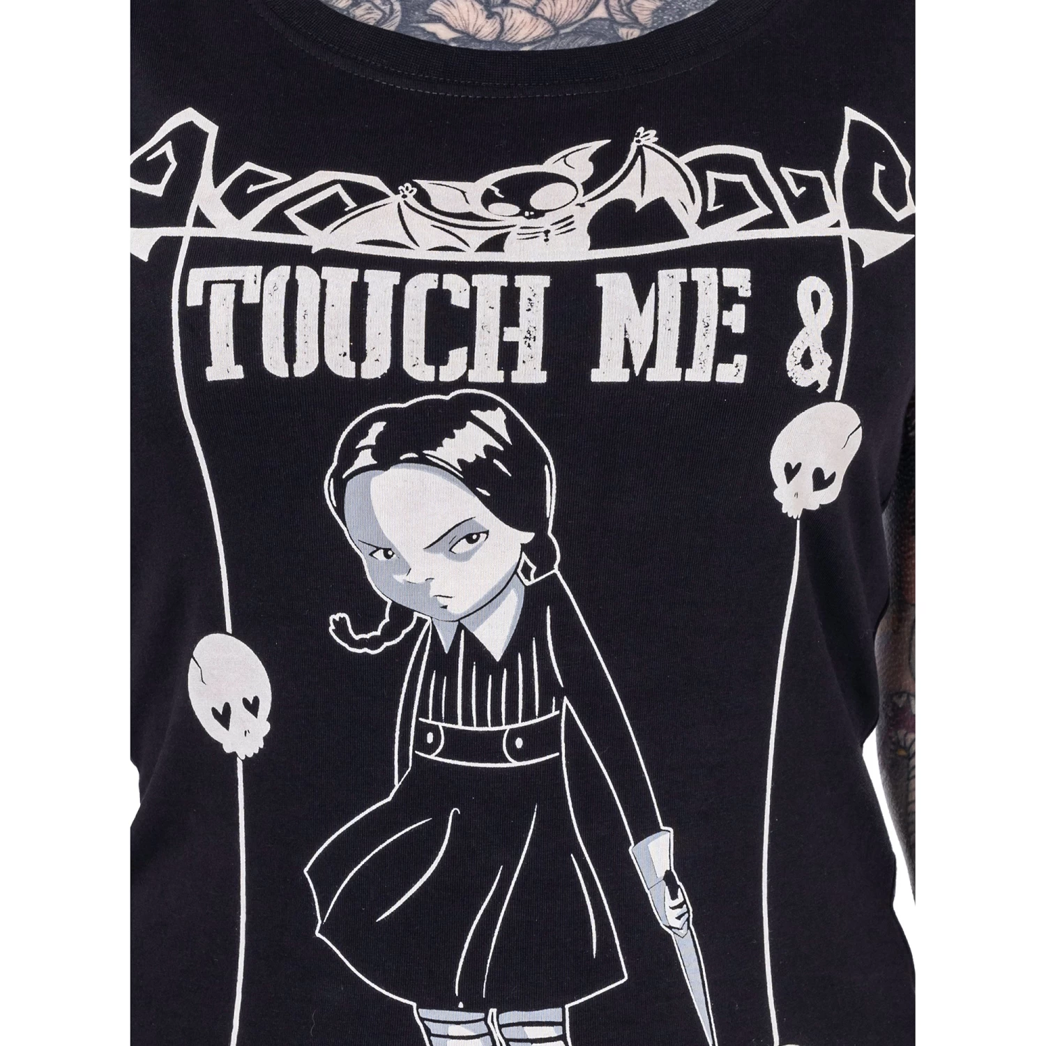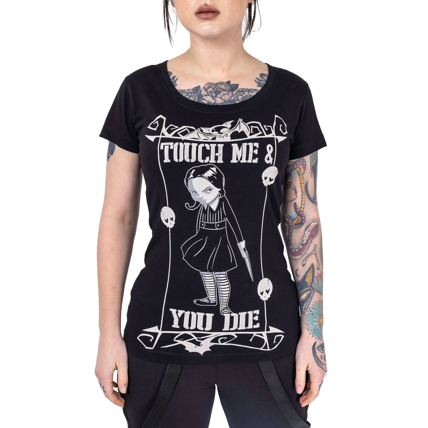 Touch her and she’ll kill you! It’s the Heartless Wednesday Touch Me You Die women’s cut t-shirt.