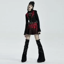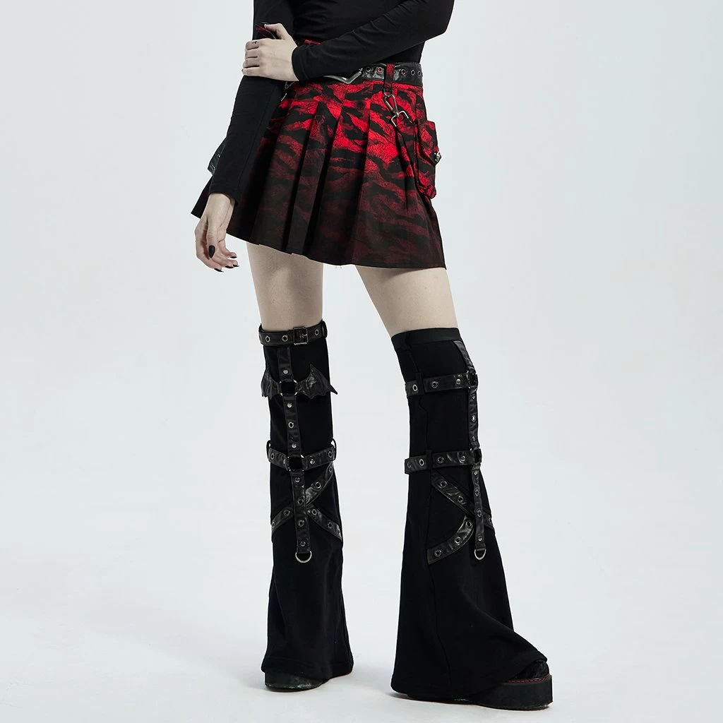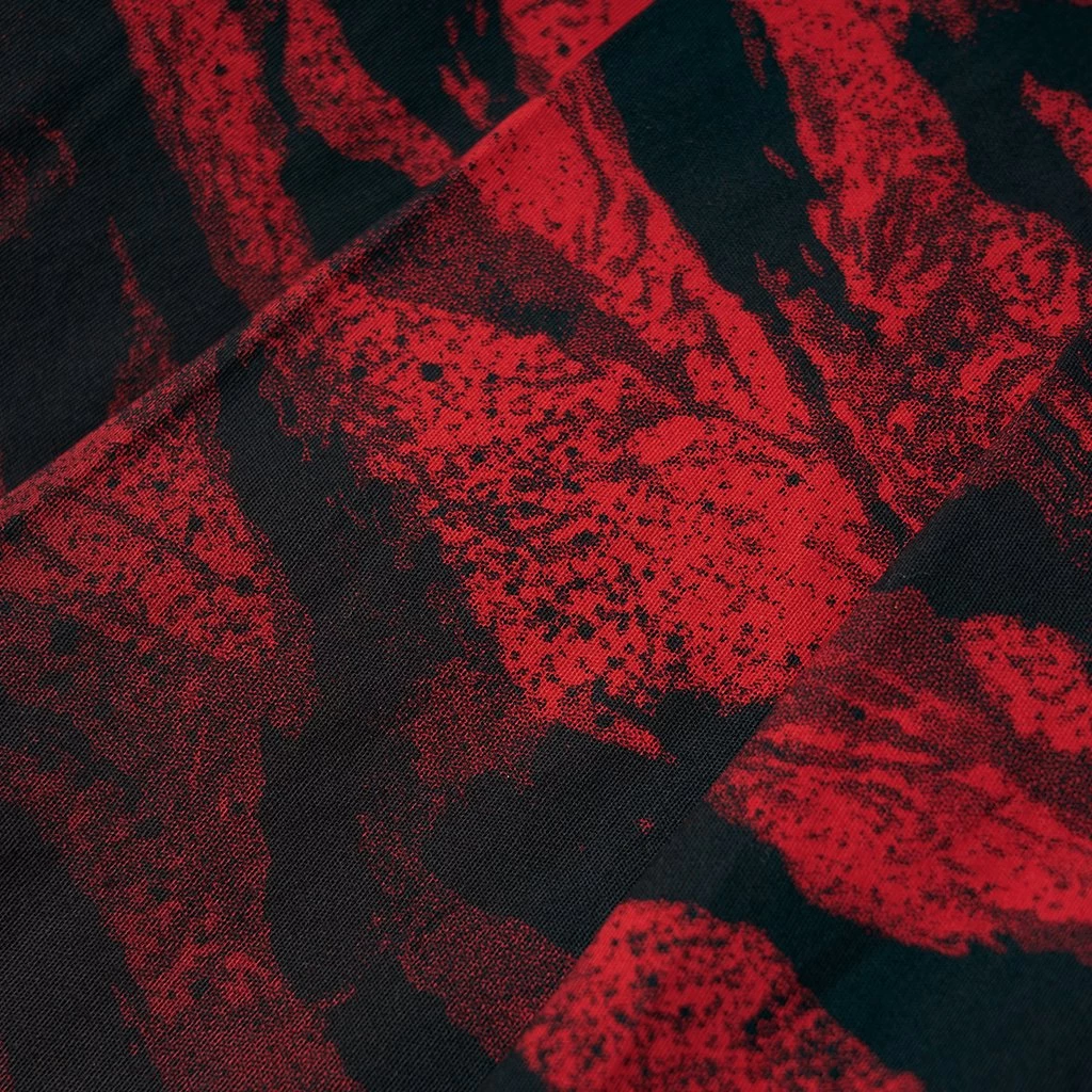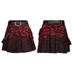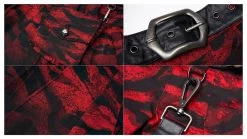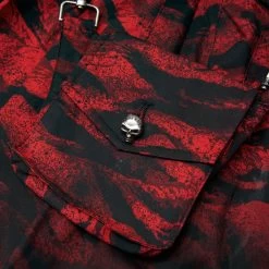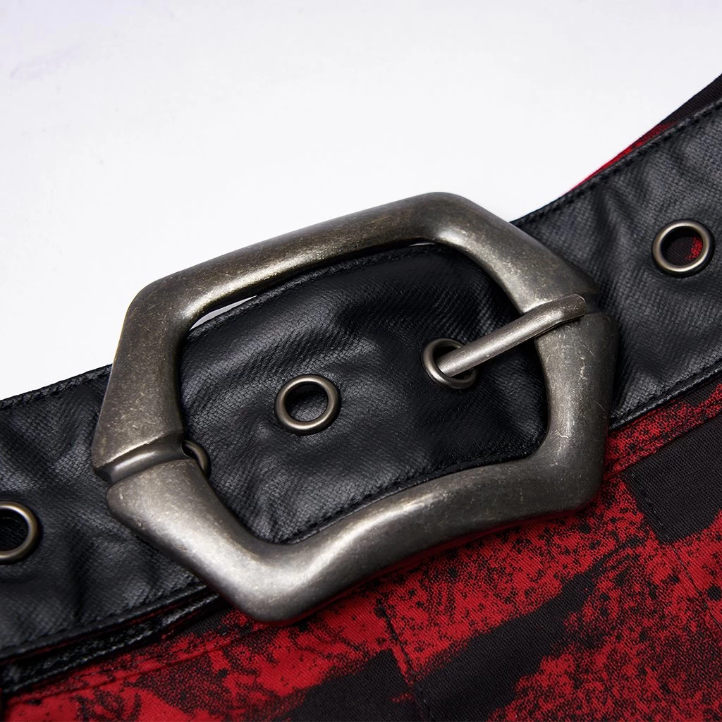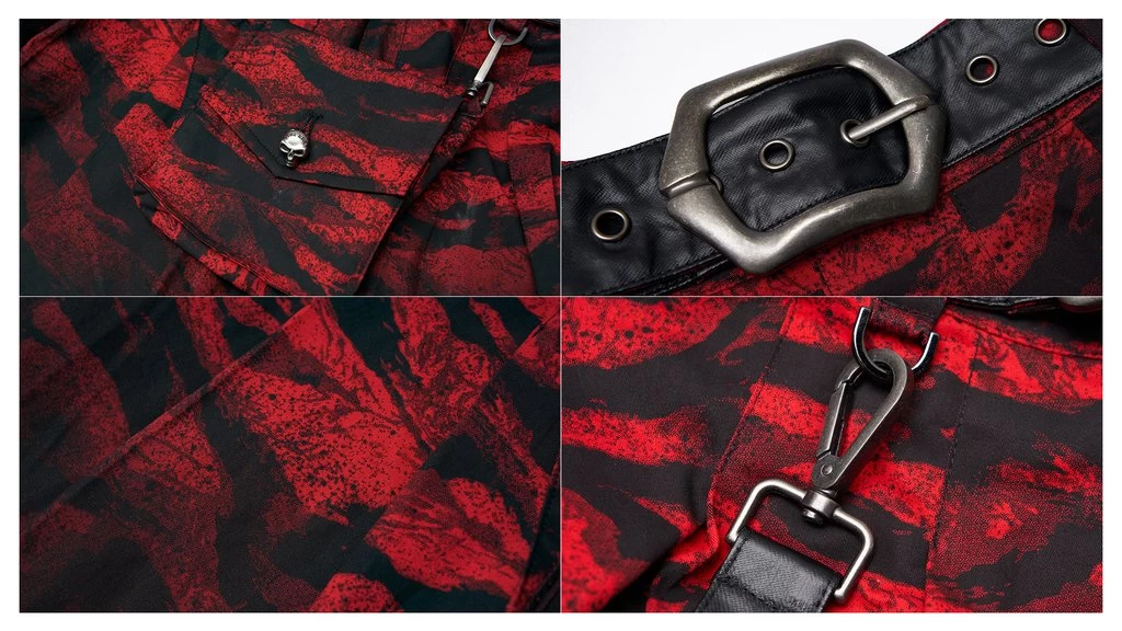 This skirt is made of abstractly printed black and red fabric with metal lobster buckles on both sides of the waist, with PU leather loops and a small, removable waist bag on one side. The waist has an adjustable heavy metal Japanese word buckle. This item is made with a special process of dip dye.