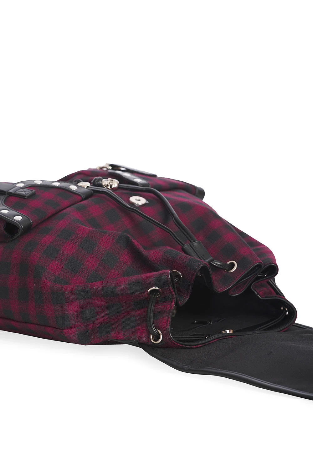 A backpack for punks! A tartan slouch style backpack with black PU trim and metal stud work.